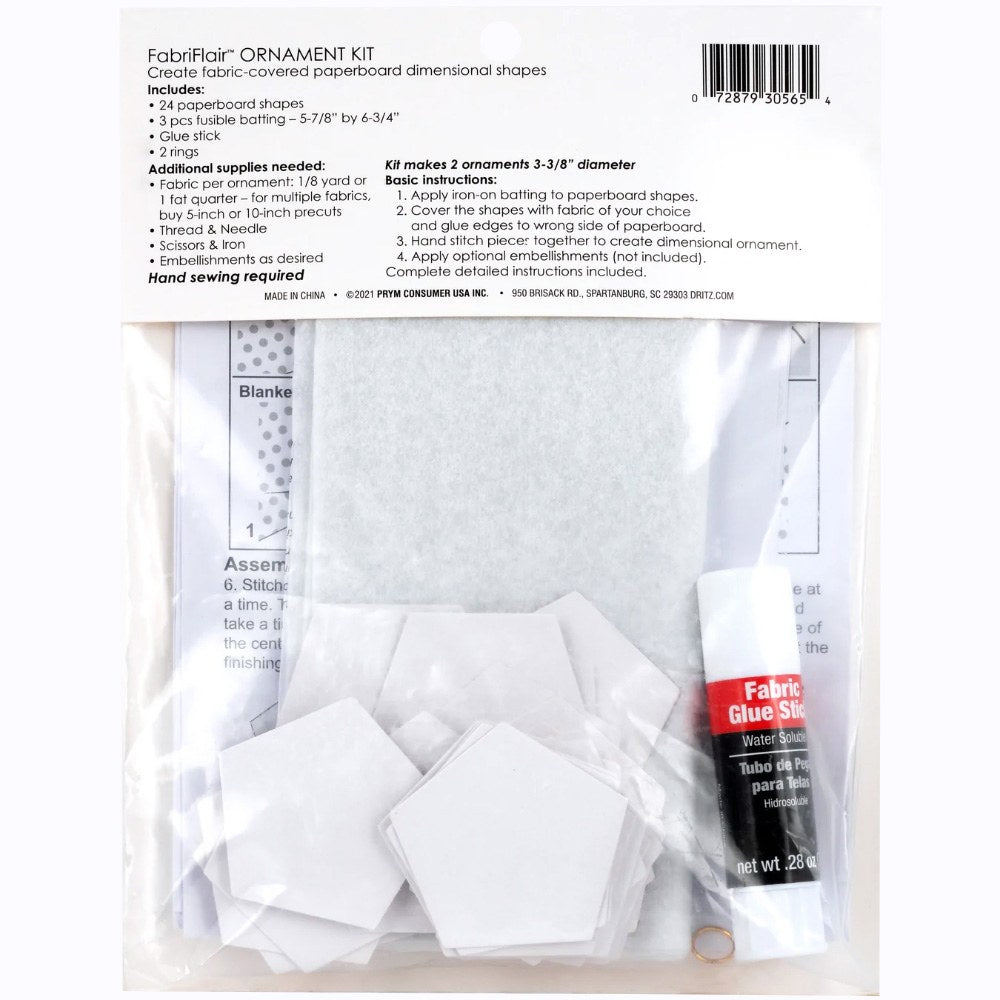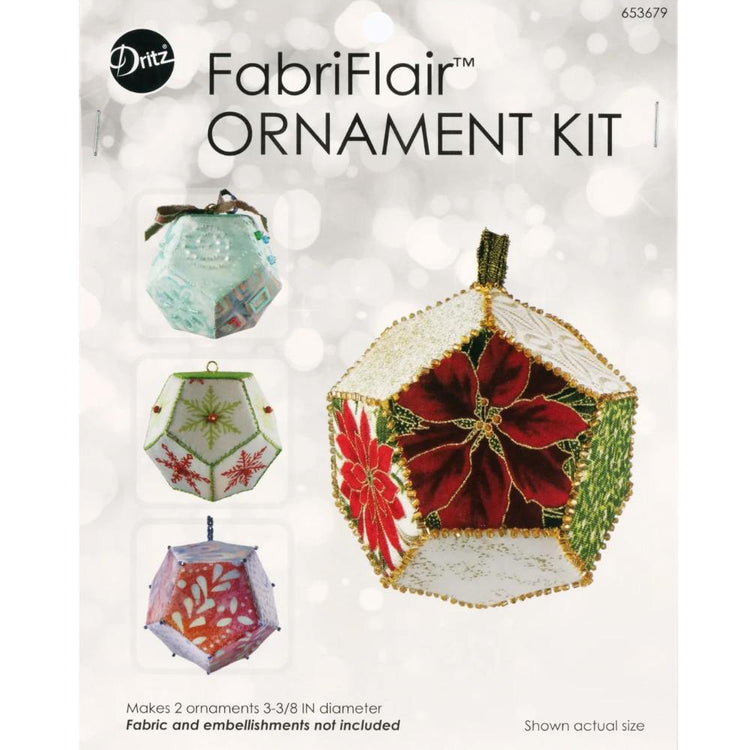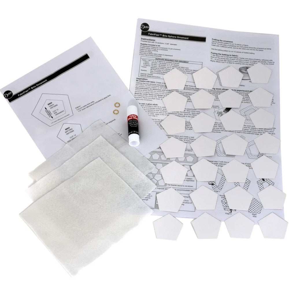 Use the FabriFlair Brio Sphere Ornament Kit to create exquisite fabric-covered three-dimensional ornaments. Hand-stitch leftover fabric scraps and embellish the shapes with decorative thread or beading. The FabriFlair Brio Sphere Ornament Kit includes instructions, patterns, and supplies to create two 3-3/8" diameter ornaments. Addtiional supplies required: Fabric 1/8 yd per ornament, thread, needle, scissors, iron, embellishments as desired (fabric and embellishments not included).