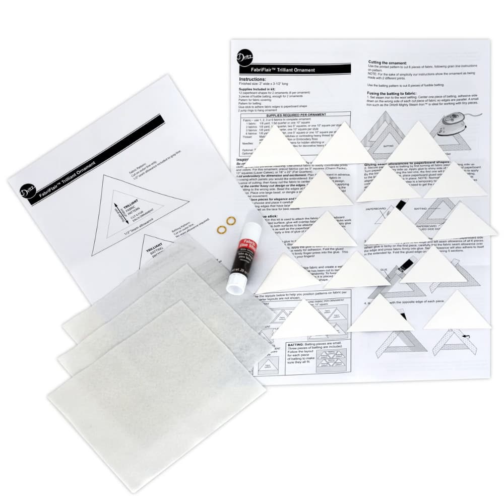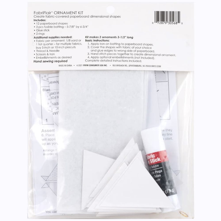 Use the FabriFlair Trilliant Ornament Kit to create exquisite fabric-covered three-dimensional ornaments. Hand-stitch leftover fabric scraps and embellish the shapes with decorative thread or beading. The FabriFlair Trilliant Ornament Kit includes instructions, patterns, and supplies to create two 3-1/2" long ornaments. Addtiional supplies required: Fabric 1/8 yd per ornament, thread, needle, scissors, iron, embellishments as desired (fabric and embellishments not included).