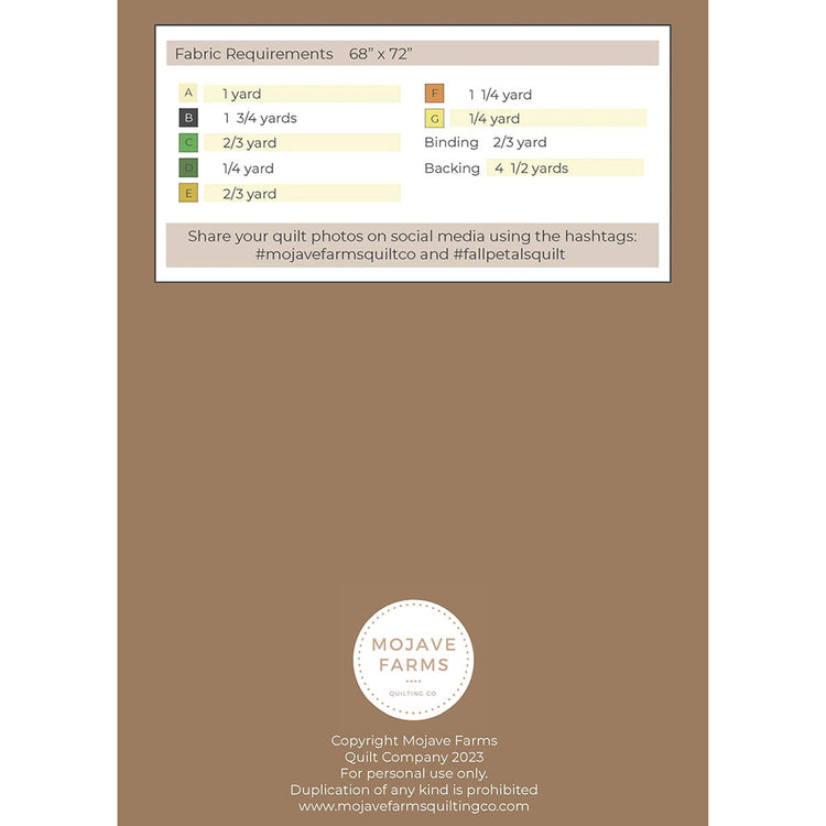 Fall Petals by Ellen Perez is a beginner-level pattern that only creates a throw-sized quilt (68" x 72"). This pattern includes instructions and diagrams, as well as a coloring page to help you plan your desired quilt. Take in the fall season with your desired Fall Petals quilt!