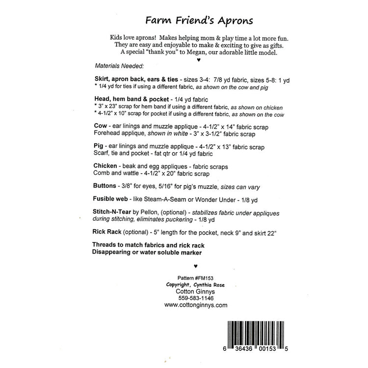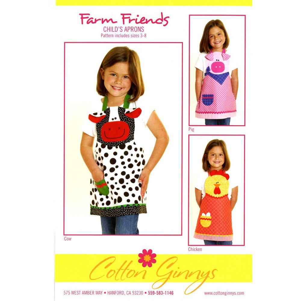 Enjoy three easy-sew aprons for children. Each pattern includes a different farm friend. Choose the cow, chicken, or pig. Sizes range from 3 to 8.