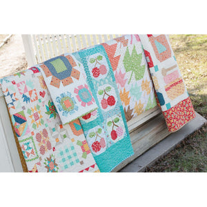 Farm Girl Vintage by author Lori Holt. This quilt sampler includes 45 blocks in 2 sizes (6in and 12in) and 14 projects. These 14 projects include quilts, table runners, a table topper, and a potholder. Mix and match the sampler blocks to make an endless number of unique quilts. Farm Girl Vintage is a spiralbound book which makes it easy to lay flat. Page count: 144.