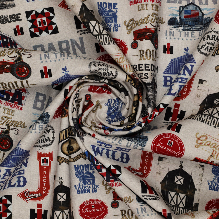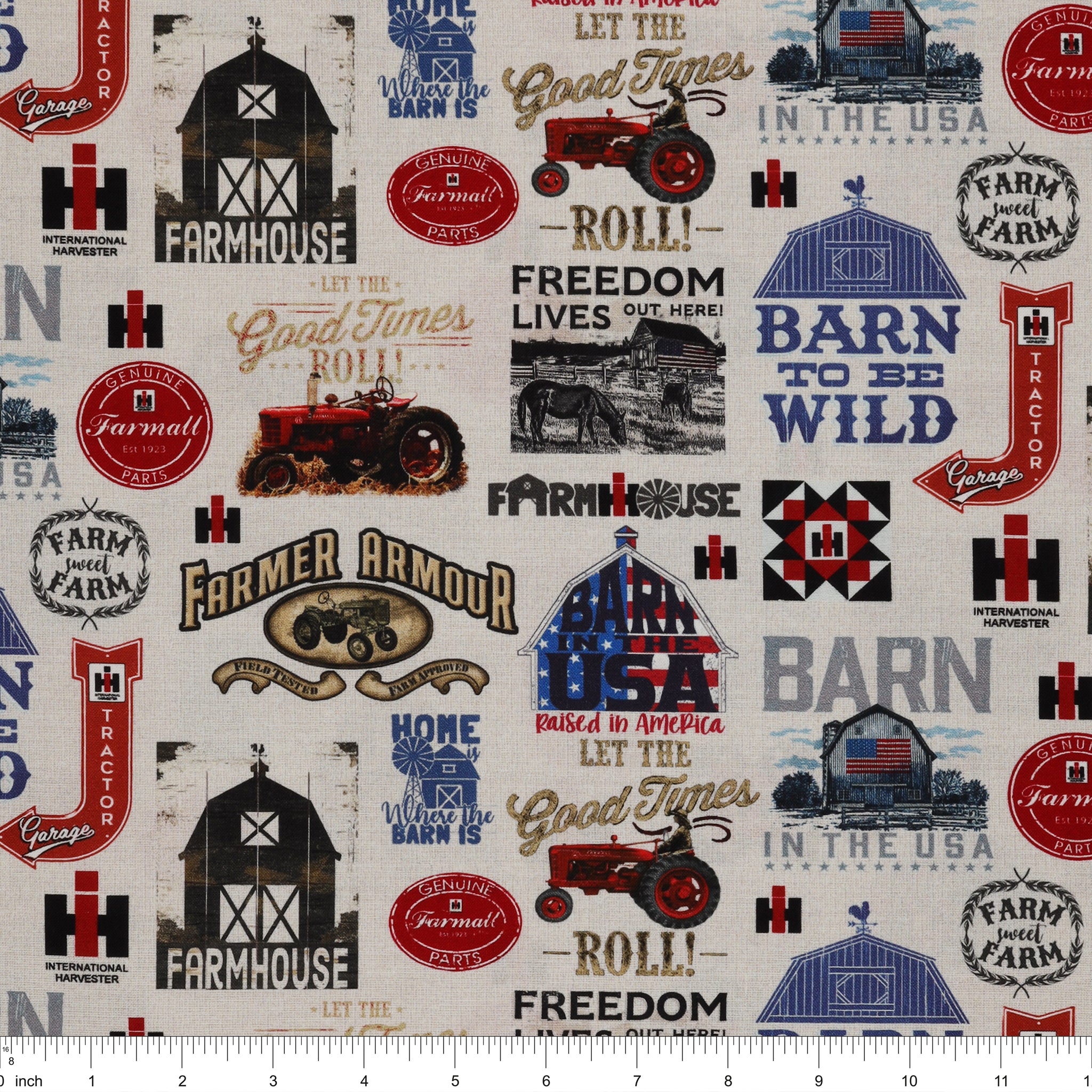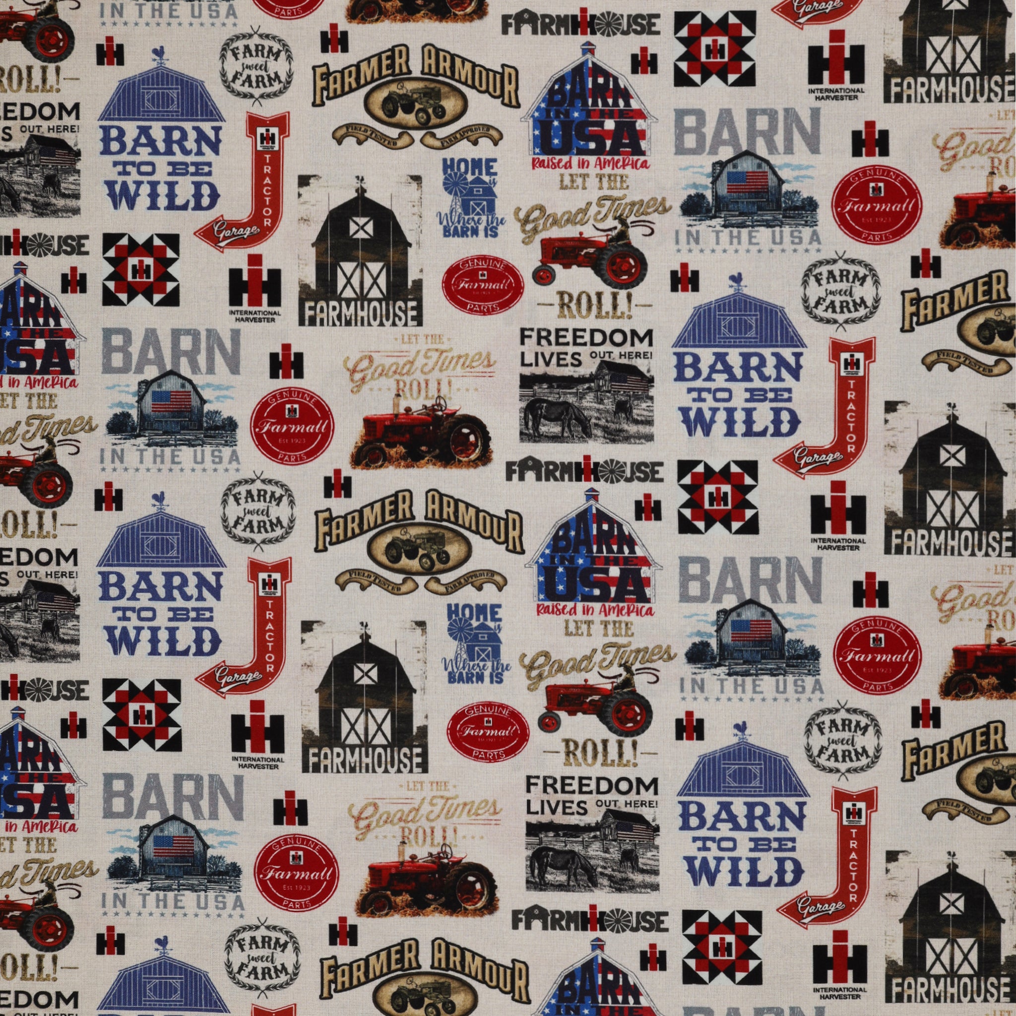 The Farmall Signs fabric brings together the best parts of country living in a lively collage of farm-themed graphics and vintage-style wording. Printed on 100% cotton and set against a soft, oatmeal-colored background, you'll find bold barn silhouettes, rustic tractor emblems, patriotic motifs, quilt-block accents, and nostalgic slogans like "Let the Good Times Roll" and "Barn to Be Wild." Shades of denim blue, weathered black, tractor red, and warm tan create a nostalgic palette that feels like a wall of favorite signs collected from fairs, workshops, and old barns over the years. The overall pattern has an easygoing, Americana charm—something that reminds you of road trips down rural highways or summer days spent at the county fair.