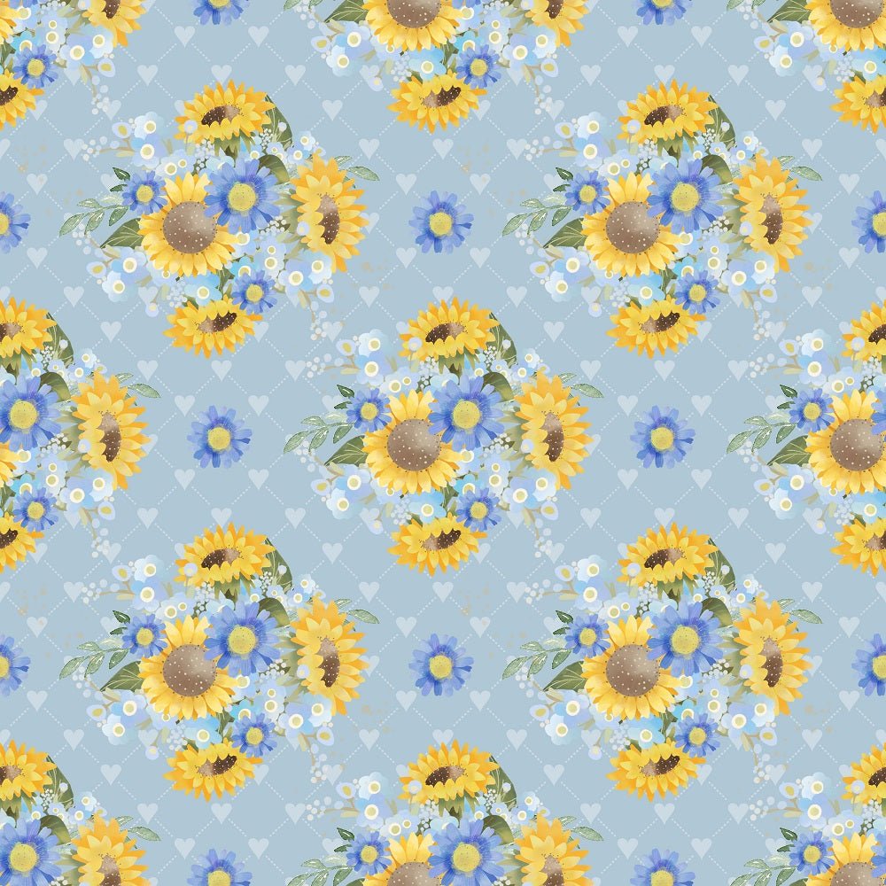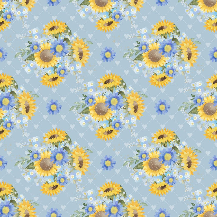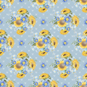 The Blue Farmhouse Sunflowers Bouquet Fabric is part of the Farmhouse Sunflowers Fabric Collection printed by Sew Creative Fabrics. Digitally Printed on 100% cotton.