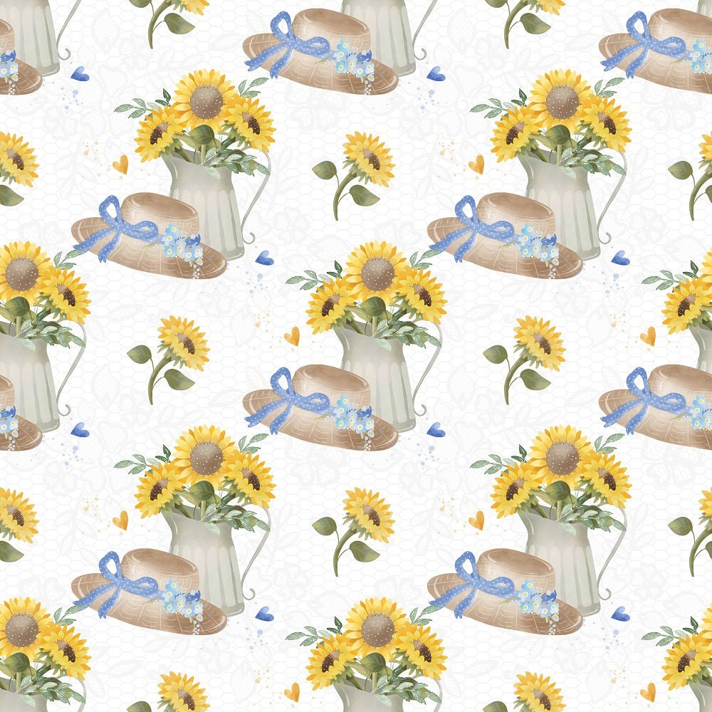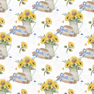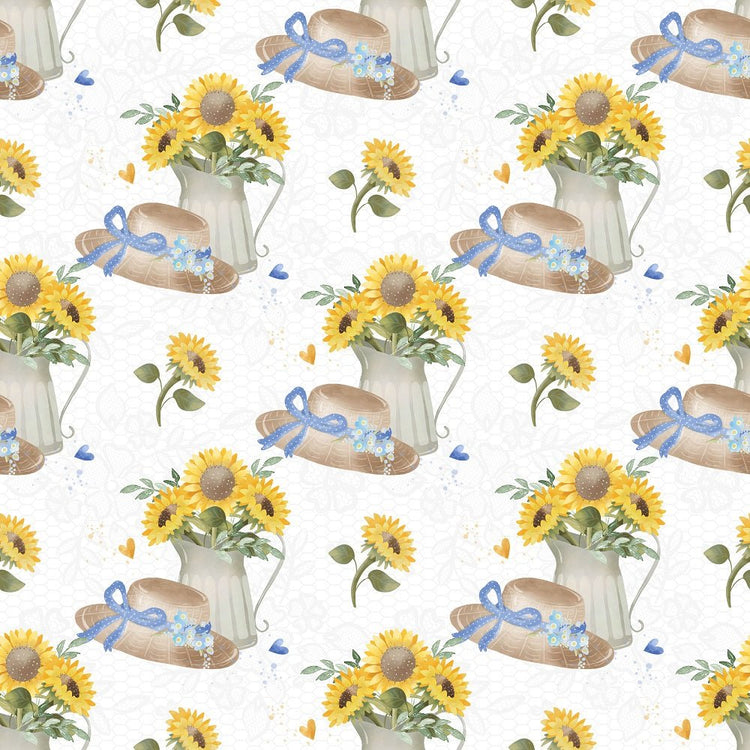 The White Farmhouse Sunflowers on Lace Fabric is part of the Farmhouse Sunflowers Fabric Collection printed by Sew Creative Fabrics. Digitally Printed on 100% cotton.