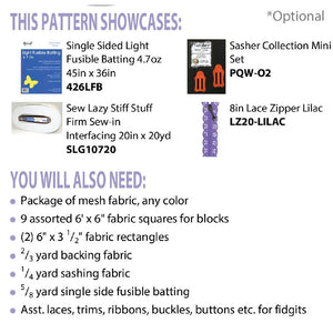 The Fidget Sensory Mat Pattern, designed by Amy Smith, is the perfect gift for your little one. This playmat finishes to 20in square and features nine blocks, each with a different sensory fidget toy. The Fidget Sensory Mat can be completed in two to six hours. Babies will love their tummy time on this interactive mat. The pictured Fidget Sensory Mat includes the following fidgets a key, button, lace doily, buckle, beads, thread spool, mesh pocket, lace zipper, and fringe, however, you can make your mat unique by choosing your own fidget toys.