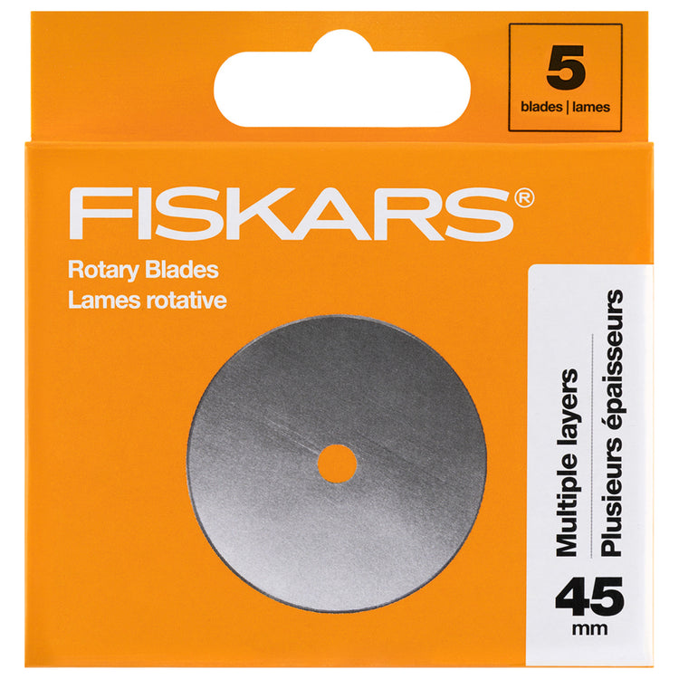 The Fiskars 45mm Rotary Blades replacements are excellent for controlled cuts on various materials such as multiple layers of fabric, paper, felt and vinyl, etc. These blades fit most 45mm rotary cutters. The high-grade precision-ground, premium steel Fiskars 45mm Rotary Blades stay sharper longer than other rotary blade replacements.