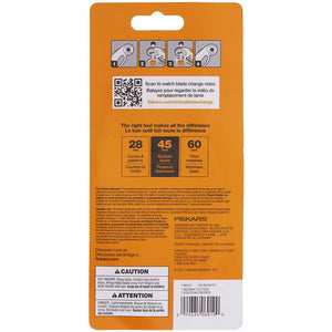 The Fiskars 45mm Rotary Cutter is spectacular for cutting through multiple layers of fabric, paper, felt, and vinyl. The 45mm blade is made with high-grade, precision-ground premium steel that stays sharper longer, and the rotary blade can be installed on either side, making it excellent for both right and left-handed users. The Fiskars 45mm Rotary Cutter features a curved, loop-handle design that enhances control and allows you to keep the cutter in hand while rearranging materials. It even includes a sliding button that extends the blade during use, locks it into position, and retracts it for safe storage and travel. Please note that Fiskars has changed this style of Rotary Cutter, so what you receive may look slightly different than what is pictured.