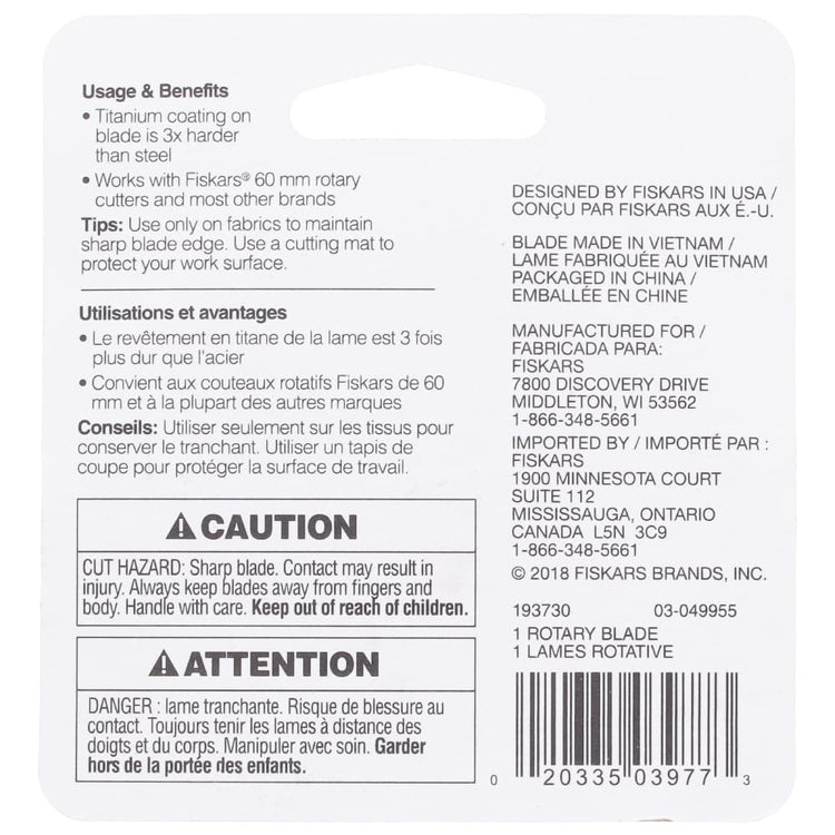If you are looking to make crisp cuts on varying materials, Fiskars Rotary Blades are the way to go. This Rotary Cutter Blade will outlast most rotary blades on the market thanks to its top-grade stainless steel. Made to cut through felt, paper, vinyl, and fabric layers with ease and precision, this Fiskars Rotary Blade will fit the 60mm Fiskars Rotary Blade Cutters and most major brands in the 60mm size.