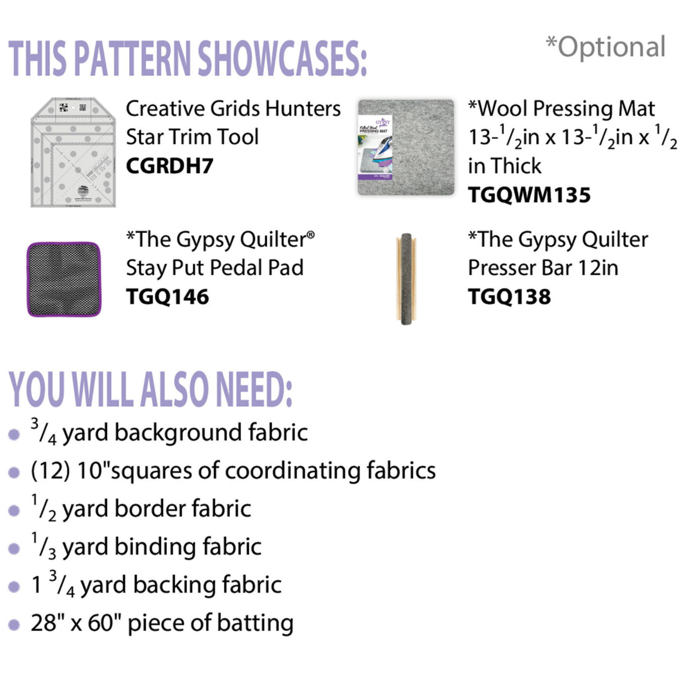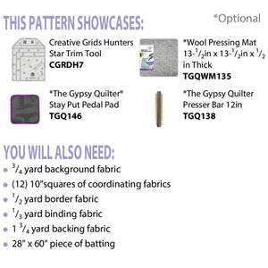 Floating Stars is a pattern that makes a scrappy 10" square quilt, table runner, or home decor. To make this pattern, use the Creative Grids Hunter’s Star Trim Tool to make this pattern more effortless! (The Creative Grids Hunter's Star Trim Tool can be sold separately). By the end, you should have twelve eight-inch finished stars that should go together quickly. This pattern lets you cut your own or use leftover squares from your stash and end with a good-sized project. Consider using Insul Bright for the batting, allowing it to serve as both a hot pad and a stunning addition to your next party, sure to impress your guests! When your project is finished, it should measure approximately 20-1/2" x 52-1/2".