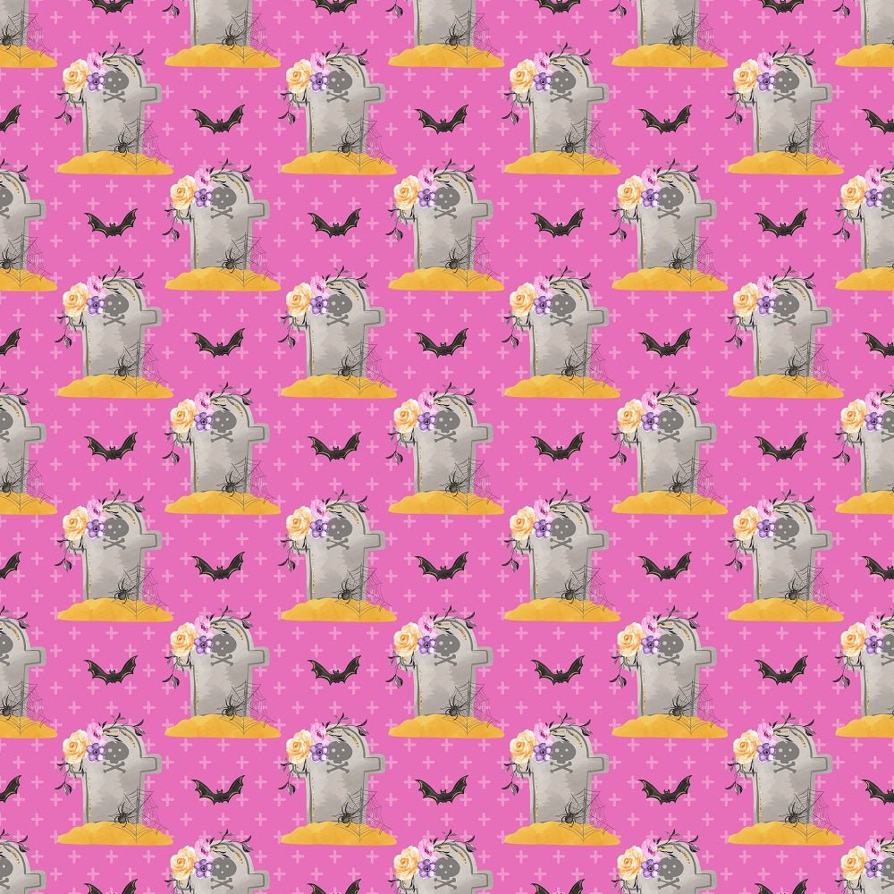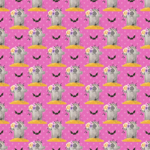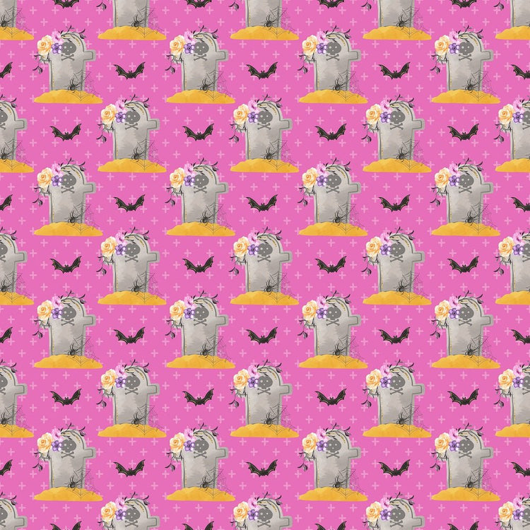 The Pink Floral Tombstones & Bats on Crosses Fabric is part of the Floral Halloween Fabric Collection printed by Sew Creative Fabrics. Digitally Printed on 100% cotton.