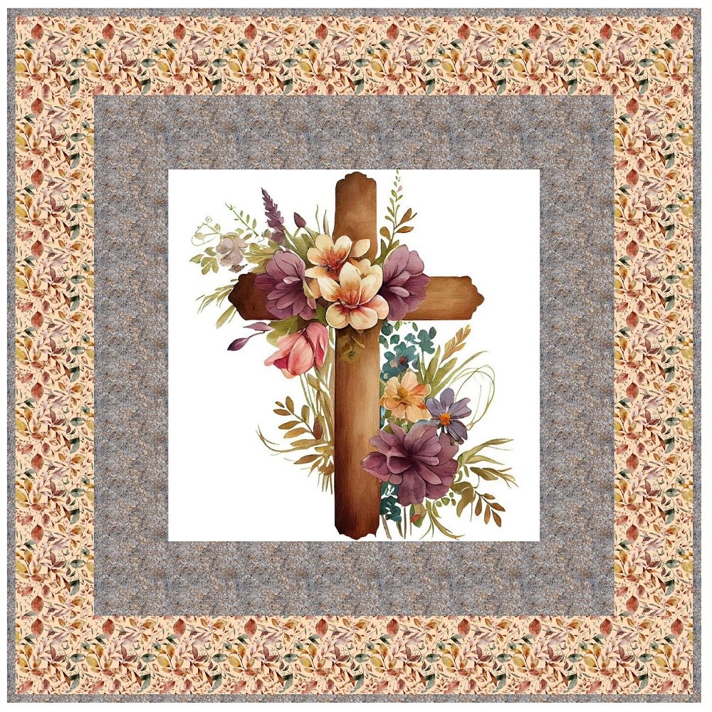 The Flowering Wood Cross Wall Hanging includes everything that you need to make the quilt - the instructions and a total of 3 1/2 yards of fabric and a 23" panel. It has two borders and is finished with a flange binding. Batting is sold separately. The finished size of this quilt is 42" x 42".
