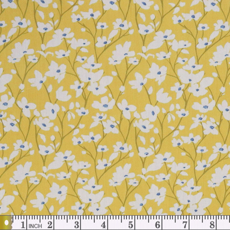 Radiating warmth like a golden afternoon, Dogwood Sunlight captures the gentle beauty of blooming branches against a vibrant yellow backdrop. Soft white dogwood-style blossoms scatter across the fabric in a breezy, organic flow, with petite blue accents adding a subtle pop of contrast. The floral repeat has a charming, hand-drawn quality that brings a touch of whimsy and elegance to any sewing project. Ideal for brightening quilts, accessories, or seasonal décor, this print evokes the feeling of walking through a sun-dappled garden in full bloom.