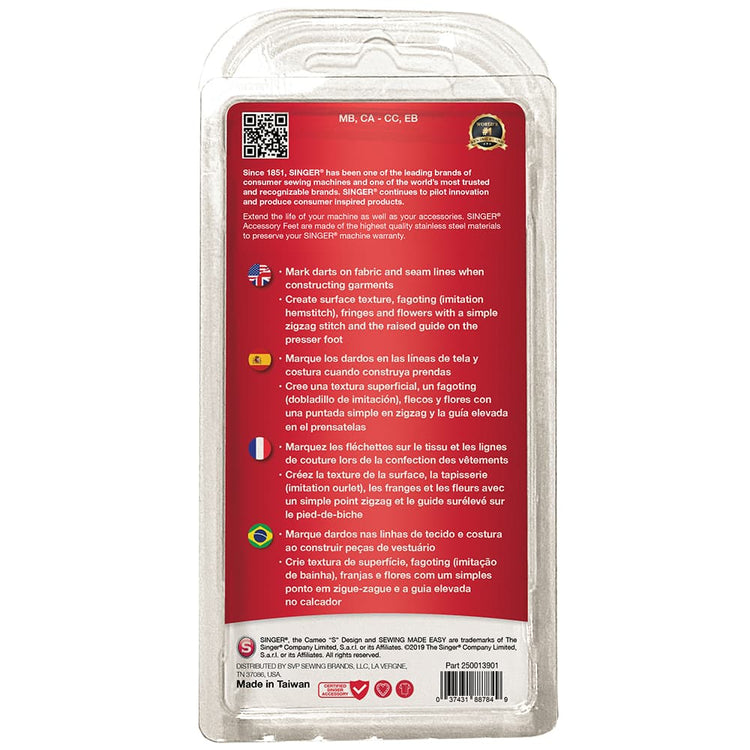 Mark darts on fabric and seam lines when constructing garments. Create surface texture, fagoting (imitation hemstitch), fringes and flowers with a simple zigzag stitch and the raised guide on the presser foot.