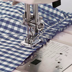 The Gathering Foot is used for lightly gathering fabric and attaching the gathered edge to flat fabric. There is a hollow space on the bottom of the foot, allowing the fabric to remain supple, and a thick bar in the front of the needle forms the gathers. This foot is also helpful for home decorating or garment making; keep your stitches straight, and the foot will do the rest.
