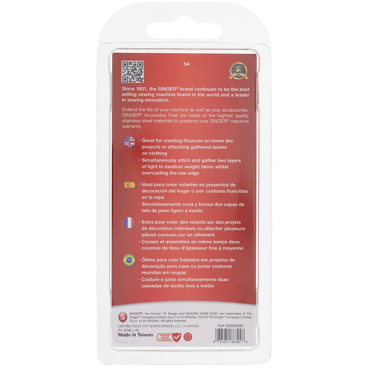 Great for creating flounces on home decor projects or attaching gathered seams on clothing. Simultaneously stitch and gather two layers of light to medium weight fabric.