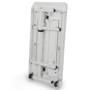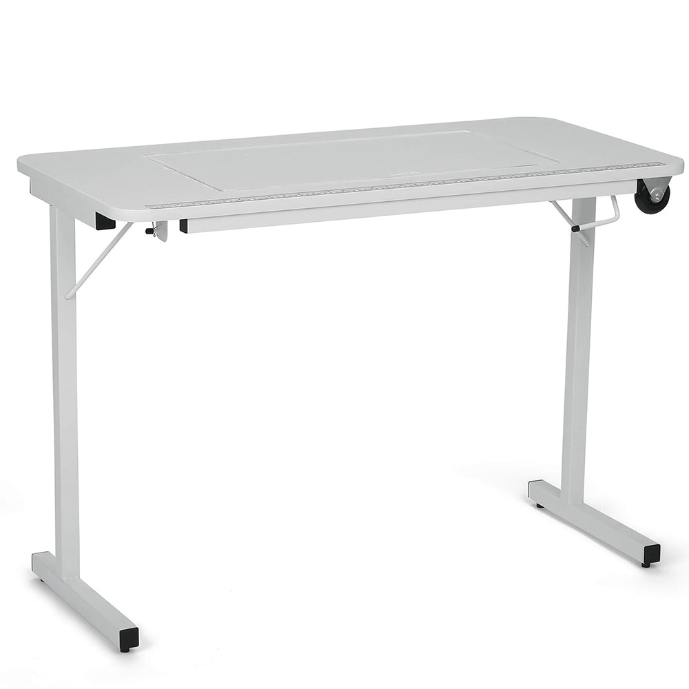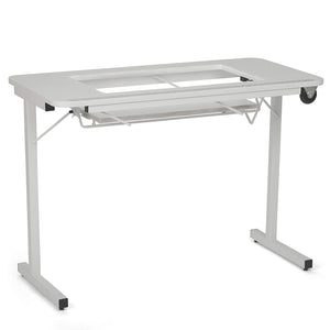 The Gidget II Table is designed for quick setup and easy storage. When the table is folded away (40-1/2" x 21-1/4" x 4-1/2"), it will easily fit under your bed or in a closet. Located under the table, on the right side, are two wheels for easy mobility and portability. Weighing approximately 35 pounds, this table is lighter than some machines and comes fully assembled!