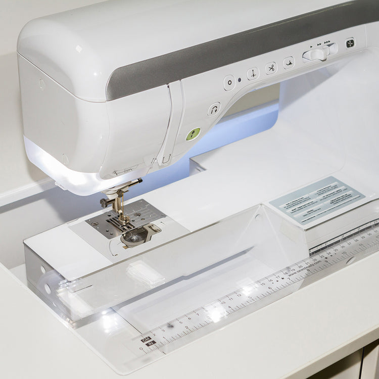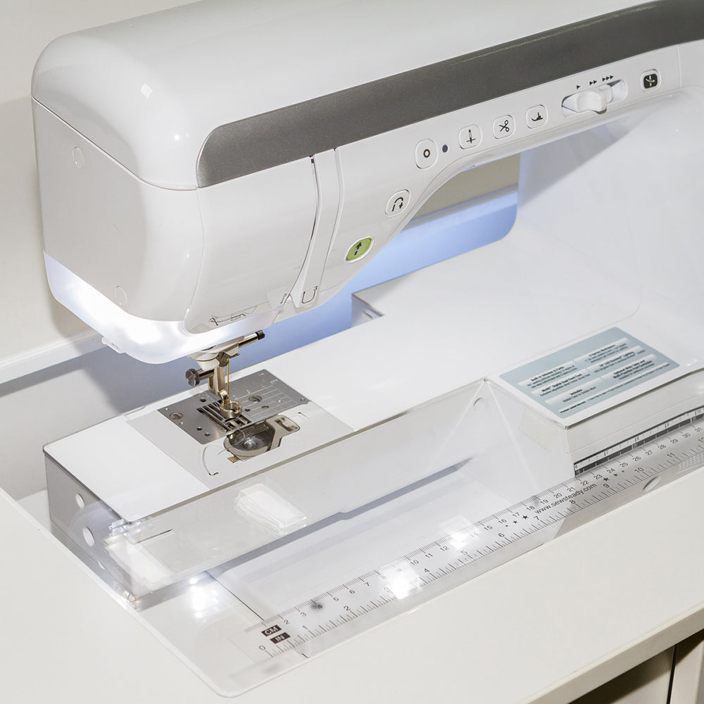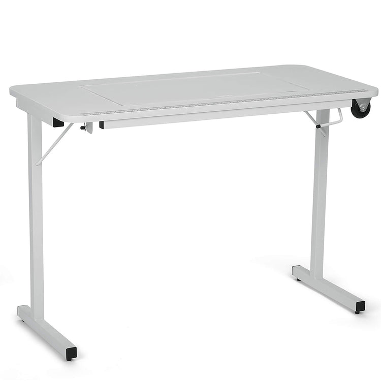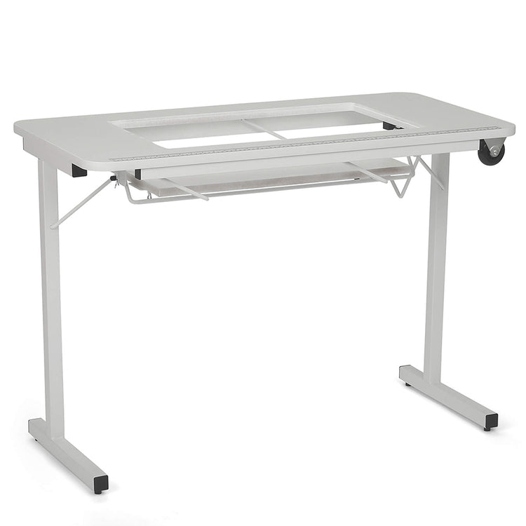 This robust table features steel locking legs and a sturdy steel base that minimizes machine vibrations and gives you straighter stitches. It has an adjustable two-position manual lift that allows you to go between the free-arm and flatbed positions. Printed directly on the table is a built-in measuring decal in both inches and centimeters. The Gidget II can handle machines that weigh up to 45 pounds. You can also customize this table by purchasing a custom acrylic sewing insert (sold separately) to create a flat sewing surface.