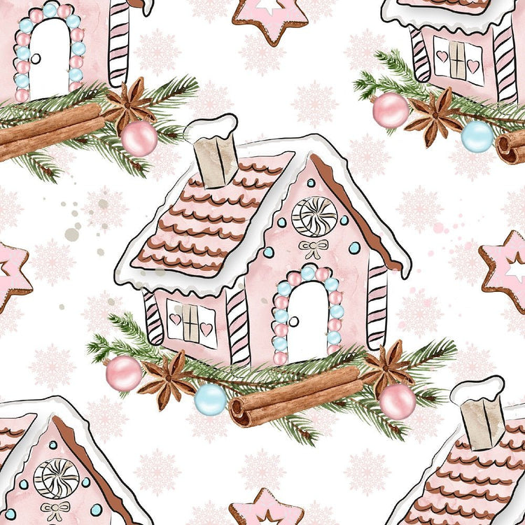 Gingerbread Houses on Snowflakes Fabric - White Details