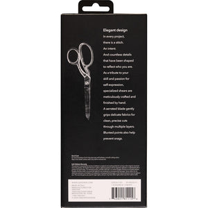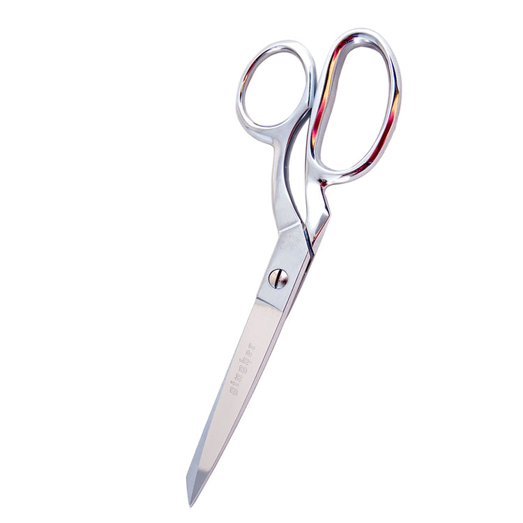 Ginghers' 8-inch Dressmaker's Shears have blunt points to prevent snags on sheer fabrics. A serrated edge gently grips fabrics, so the knife edge can flawlessly cut through multiple layers of fabric. Quilters like the bent handle design since it helps hold fabric flat on your work surface for smooth, comfortable, mistake-free cutting. The double-plated chrome finish over nickel is both pretty and durable. These shears also include a protective nylon sheath for storage.