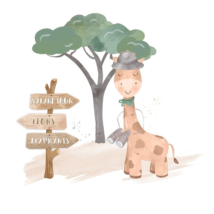 The Giraffe On A Safari Tour Fabric Panel is part of the Watercolor Safari Adventure Fabric Collection printed by Sewing Parts Online. Digitally Printed on 100% cotton. This panel is available in 6 different sizes:
