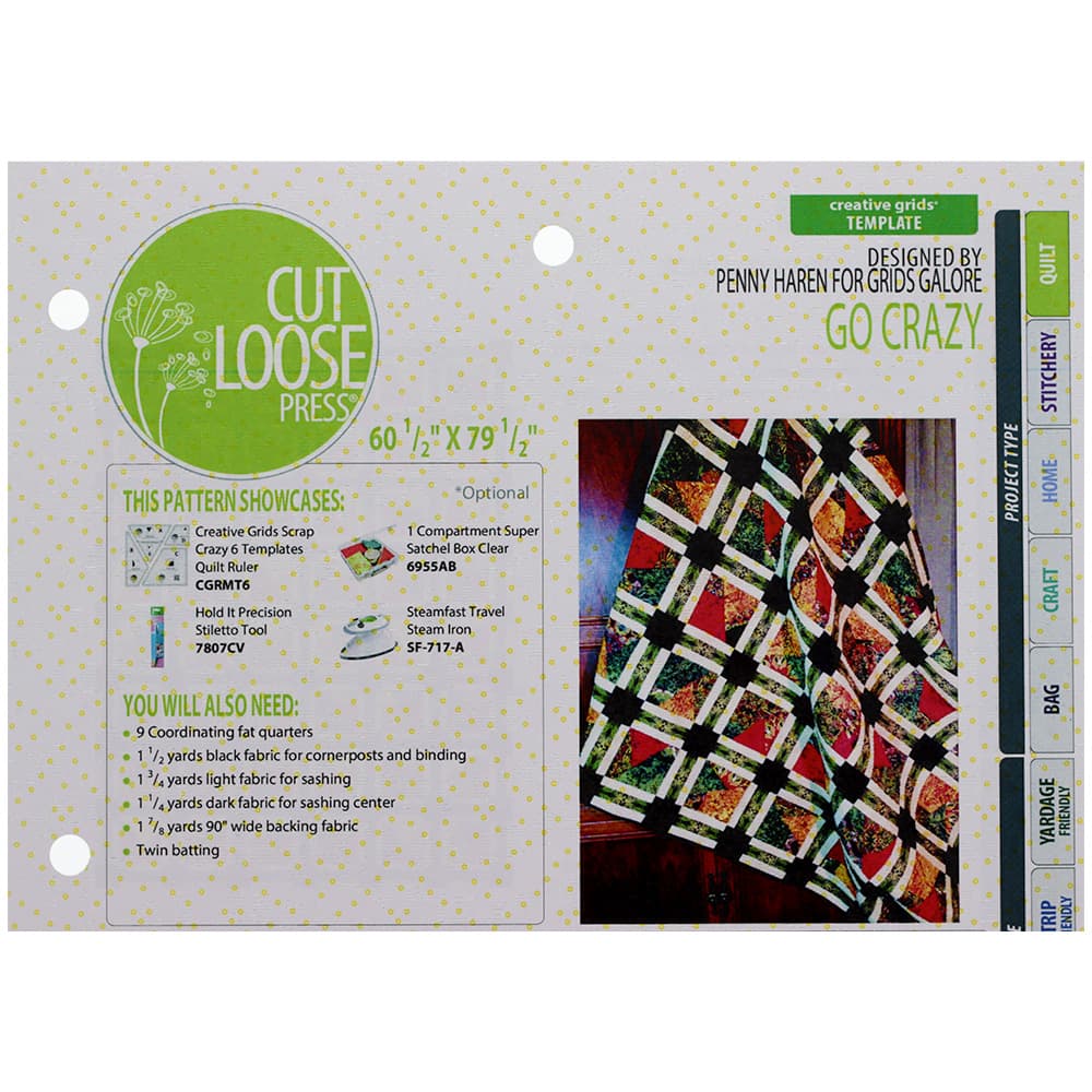 The Go Crazy Quilt Pattern, from Cut Loose Press, makes a large 60-1/2 inch by 79-1/2 inch quilt. The pattern includes a list of suggested tools as well as fabric requirements. The Go Crazy Quilt takes just over six hours to complete. The Go Crazy Quilt Pattern requires the use of Creative Grids Scrap Crazy 6 Templates.