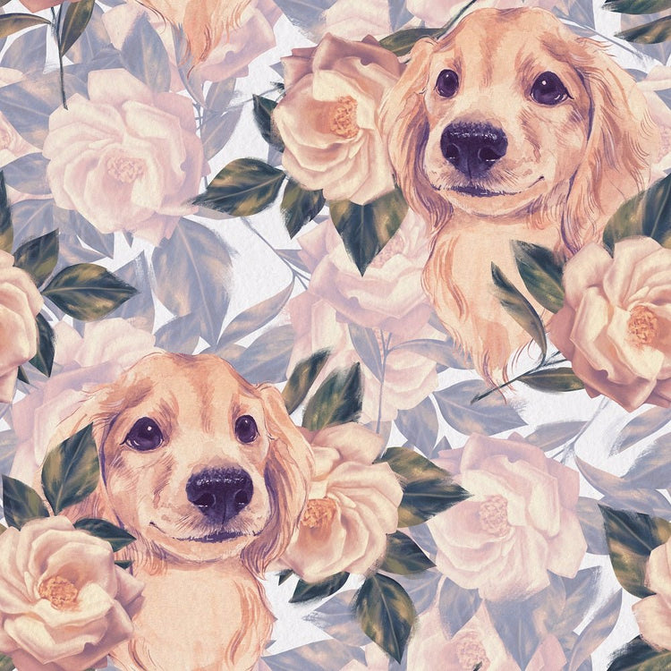 The Golden Puppy and Golden Flowers Fabric is printed by Sew Creative Fabrics. Digitally Printed on 100% cotton and measures 43-45" wide.