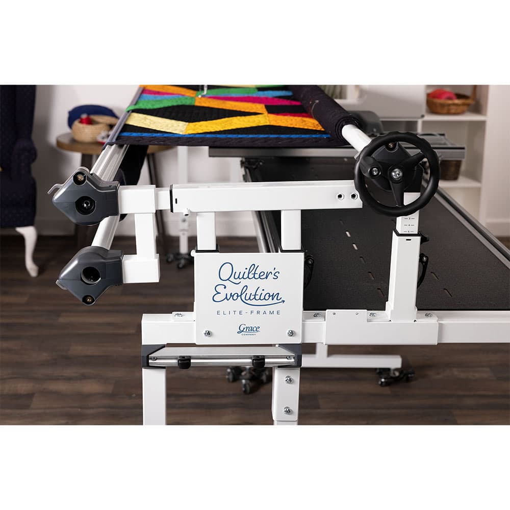 The Quilter's Evolution Elite-Frame is the culmination of Grace Company's efforts to give frame quilters an exceptional, personalized experience. This top-of-the-line frame is designed for quilters who are serious about their craft and can dedicate time and space. The Evolution Elite Frame offers up to 12 feet of quilting space, no-basting simplicity, a height-adjustable frame, and a new track design for the carriage to glide on. With steel and cast-alloy components, the Quilter's Evolution Elite-Frame is one of the sturdiest and longest–lasting frames ever made. It is a modular frame with multiple configurations and accessories. This no-baste frame is designed with the highest quality to make the entire quilting process more manageable. The frame is available in standard, 8-foot, 10-foot, and 12-foot sizes (machine not included).