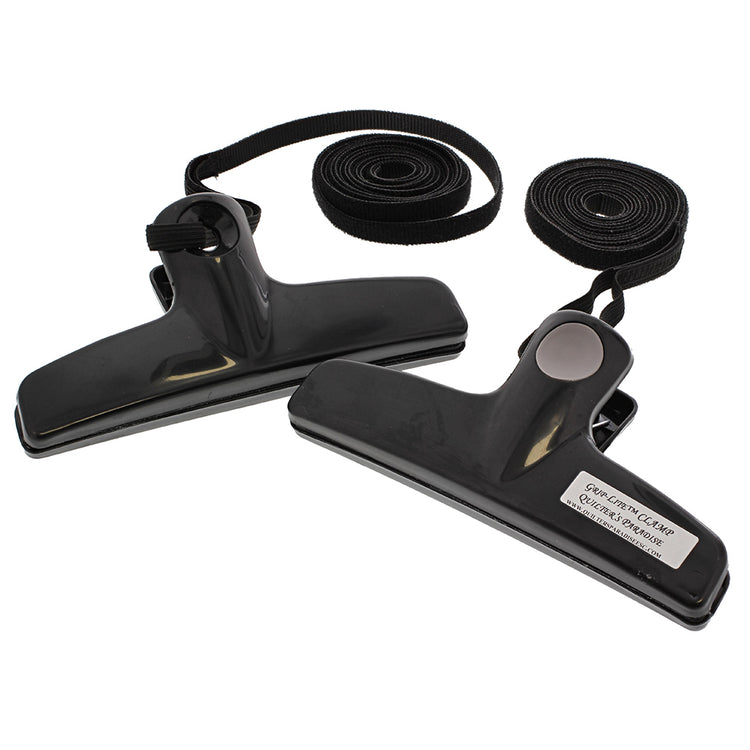 Set of two, lightweight, easy-to-open quilting clamps from Quilter's Paradise. For use with mid to longarm quilting machines, these handy clamps can be easily attached to any frame using the included elastic strip. Each clamp measures six inches and is equipped with six feet of double sided Velcro. Will not distort quilt edges.