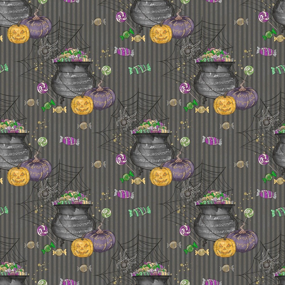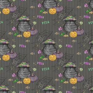 The Black Halloween Candy Elements on Stripes Fabric is part of the Halloween Candy Fabric Collection printed by Sew Creative Fabrics. Digitally Printed on 100% cotton.