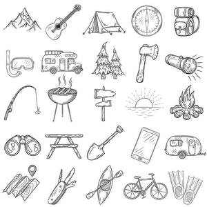 The Hand Drawn Camping Icons Fabric is part of the Black & White Fabric Collection printed by Sewing Parts Online. Digitally Printed on 100% cotton.