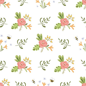 The White Hand Drawn Cartoon Bee Pink Flowers Fabric is part of the Sweet As Can Bee Fabric Collection printed by Sew Creative Fabrics. Digitally Printed on 100% cotton.