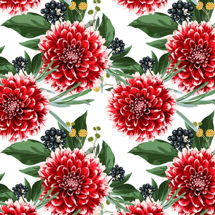 The Hand Drawn Red Dahlias & Berries Fabric is a part of the Watercolor Floral Fabric Collection printed by Sew Creative Fabrics. Digitally Printed on 100% cotton.