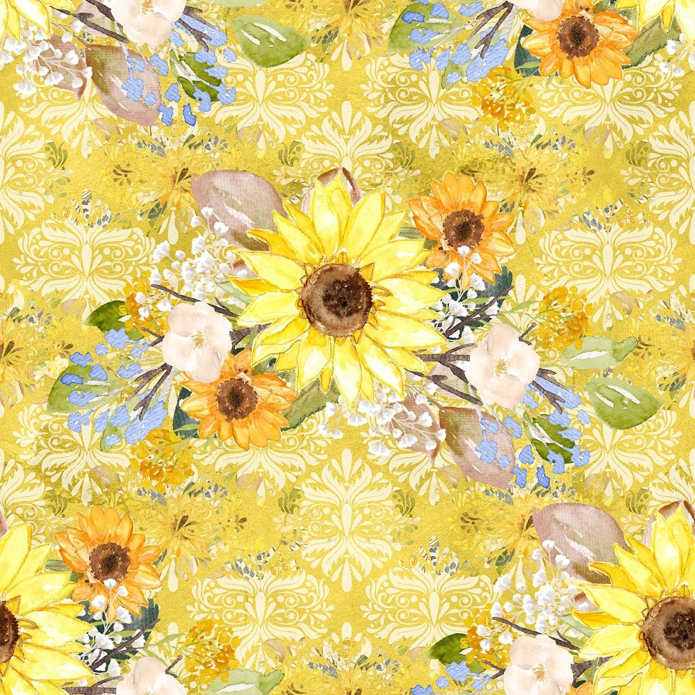The Yellow Hand Painted Sunflowers on Damask Fabric is part of the Hand Painted Sunflowers Fabric Collection printed by Sew Creative Fabrics. Digitally Printed on 100% cotton.