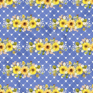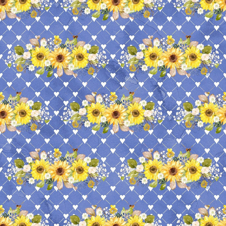 The Blue Hand Painted Sunflowers on Hearts Fabric is part of the Hand Painted Sunflowers Fabric Collection printed by Sew Creative Fabrics. Digitally Printed on 100% cotton.