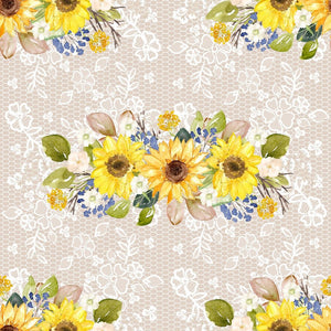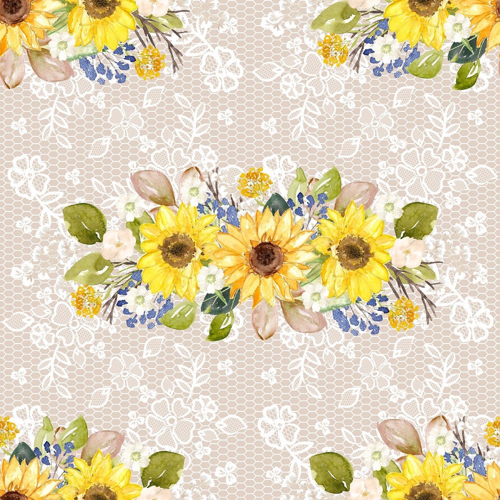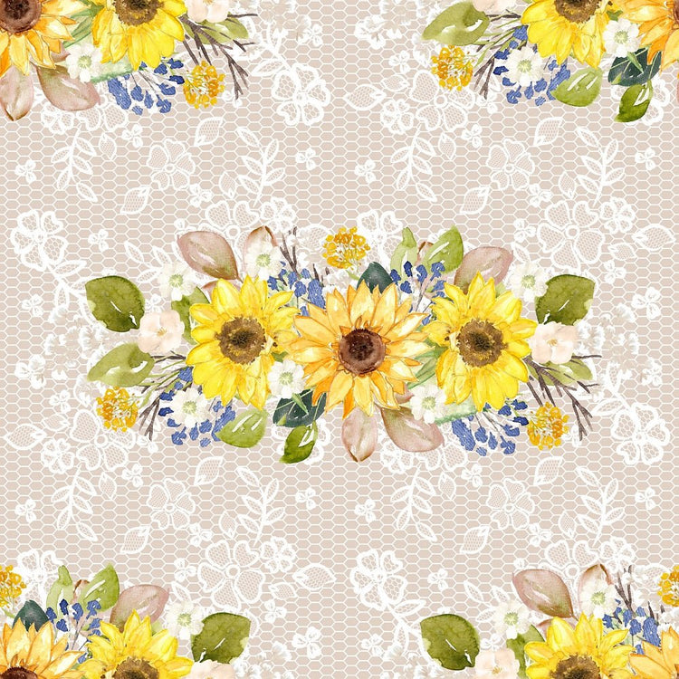 The Tan Hand Painted Sunflowers on Lace Fabric is part of the Hand Painted Sunflowers Fabric Collection printed by Sew Creative Fabrics. Digitally Printed on 100% cotton.