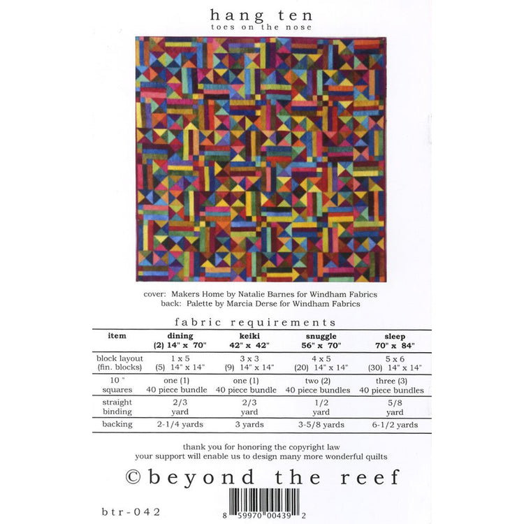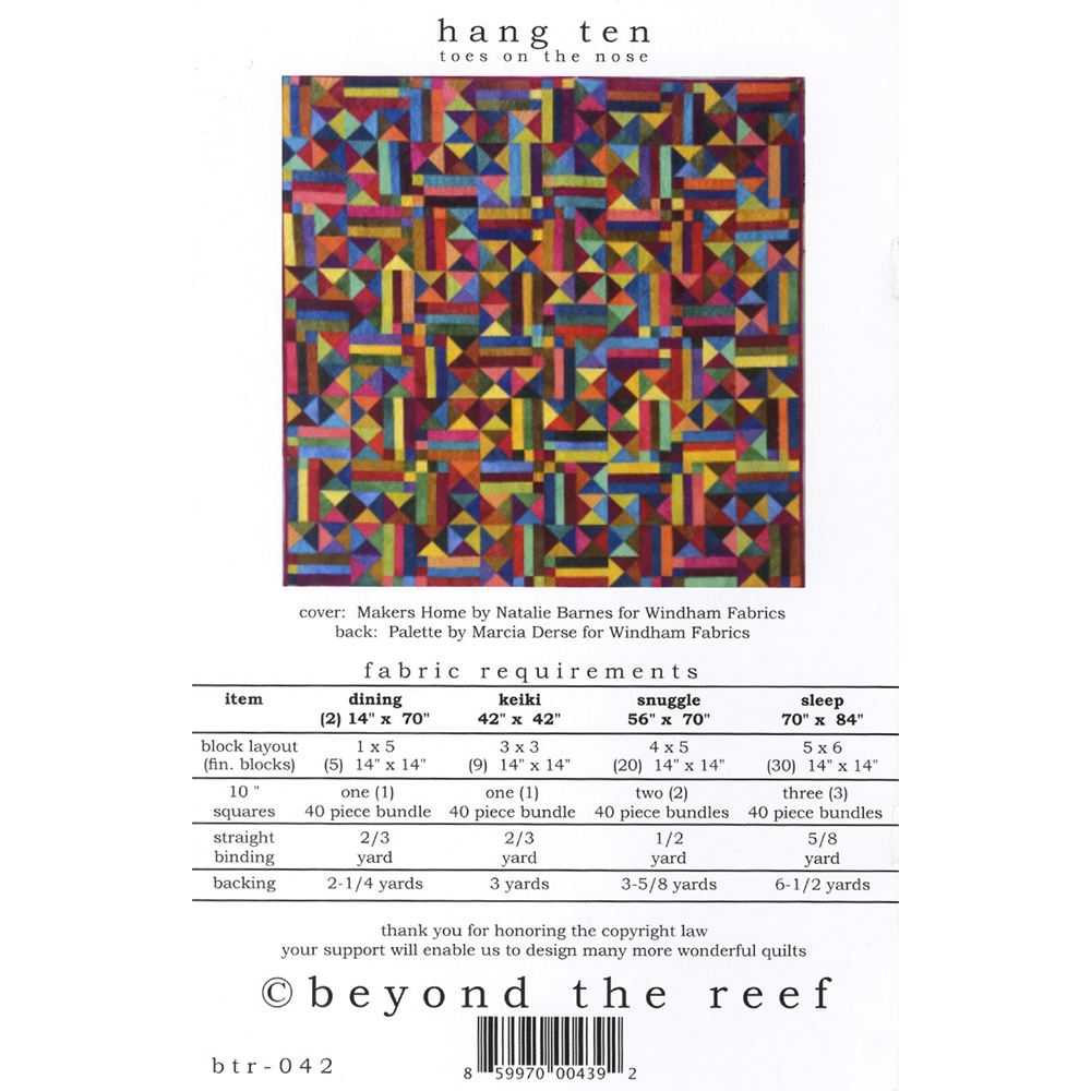 The Hang Ten Quilt Pattern from Beyond the Reef combines many design elements to create a unique geometric quilt. This colorful quilt features half square and quarter square triangles made with 10" pieces of fabric. Included with the Hang Ten Quilt Pattern, you get a list of fabric requirements and detailed instructions.