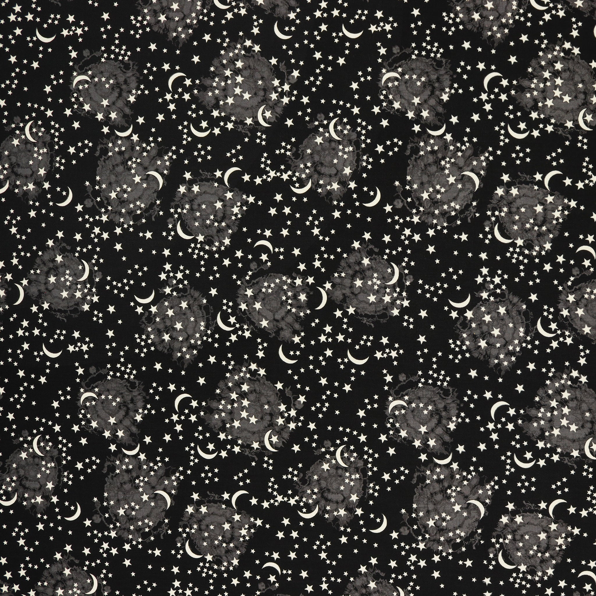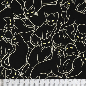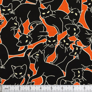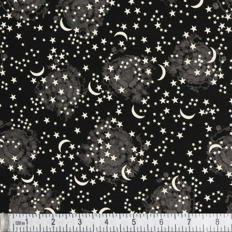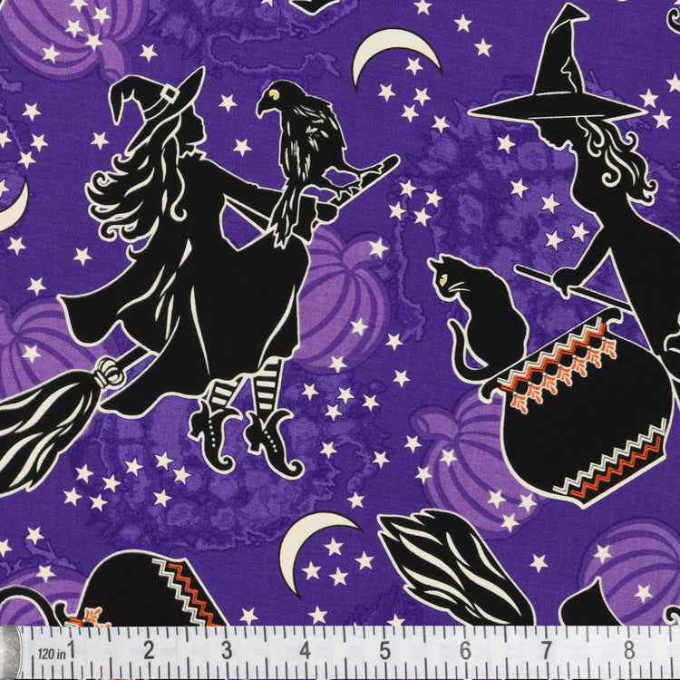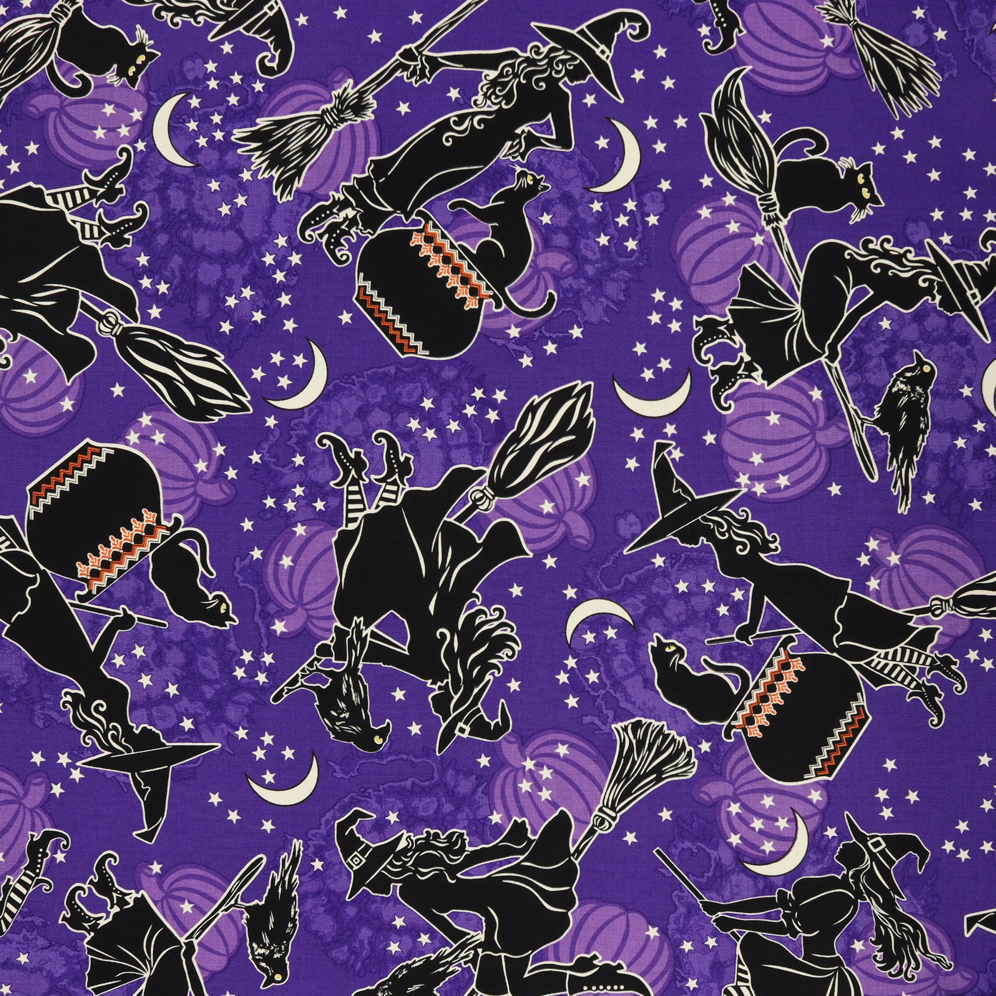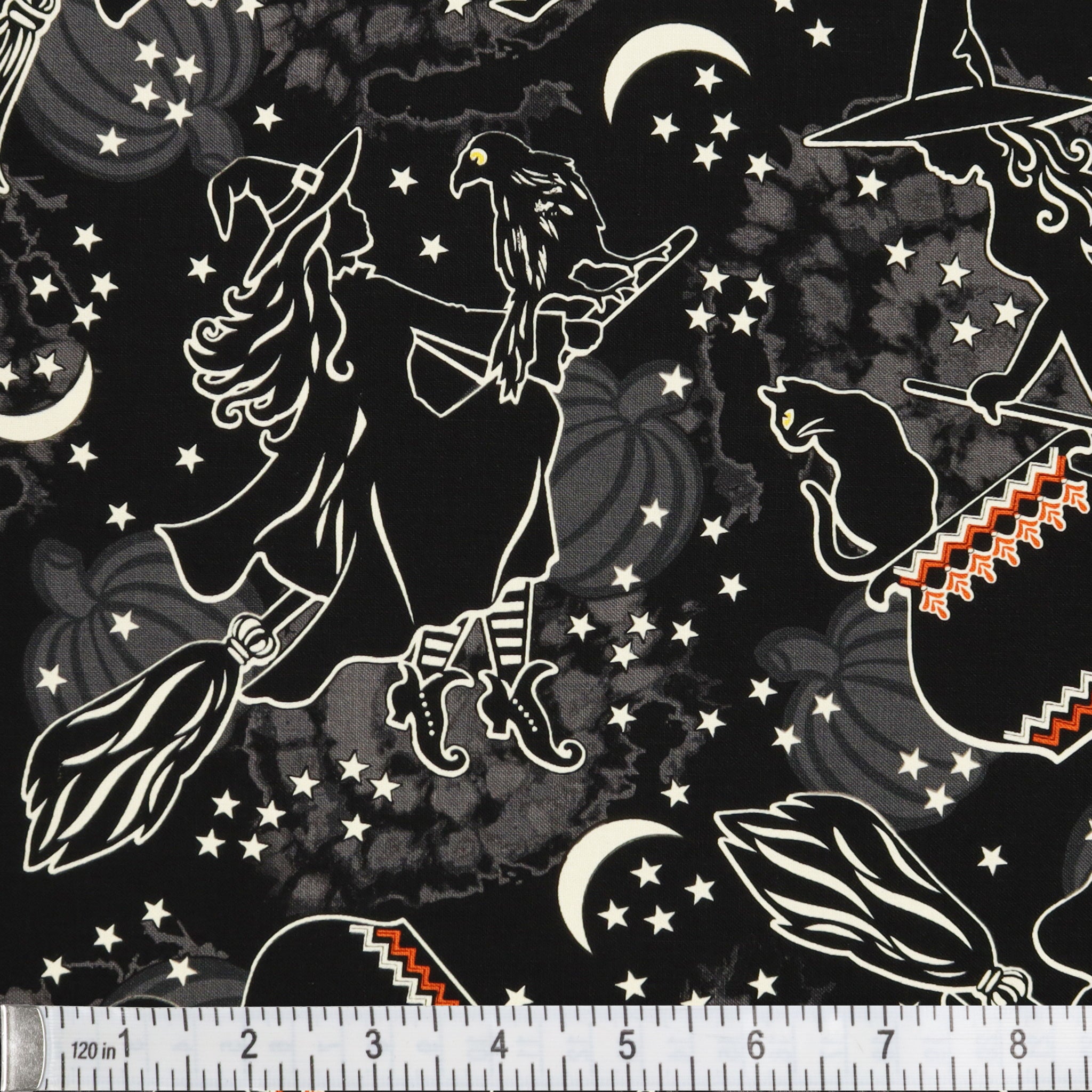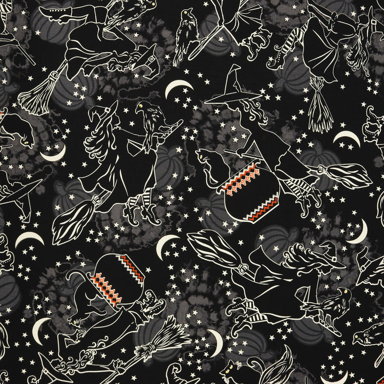 Powerful and iconic, Witchy Woman Black showcases dramatic silhouettes of flying witches, sweeping broomsticks, and swirling moons against a shadowy sky. This striking fabric adds instant energy and motion to any Halloween project. Whether used in large panels or cut into bold appliqués, Witchy Woman Black brings a sense of fierce, feminine magic to your sewing.