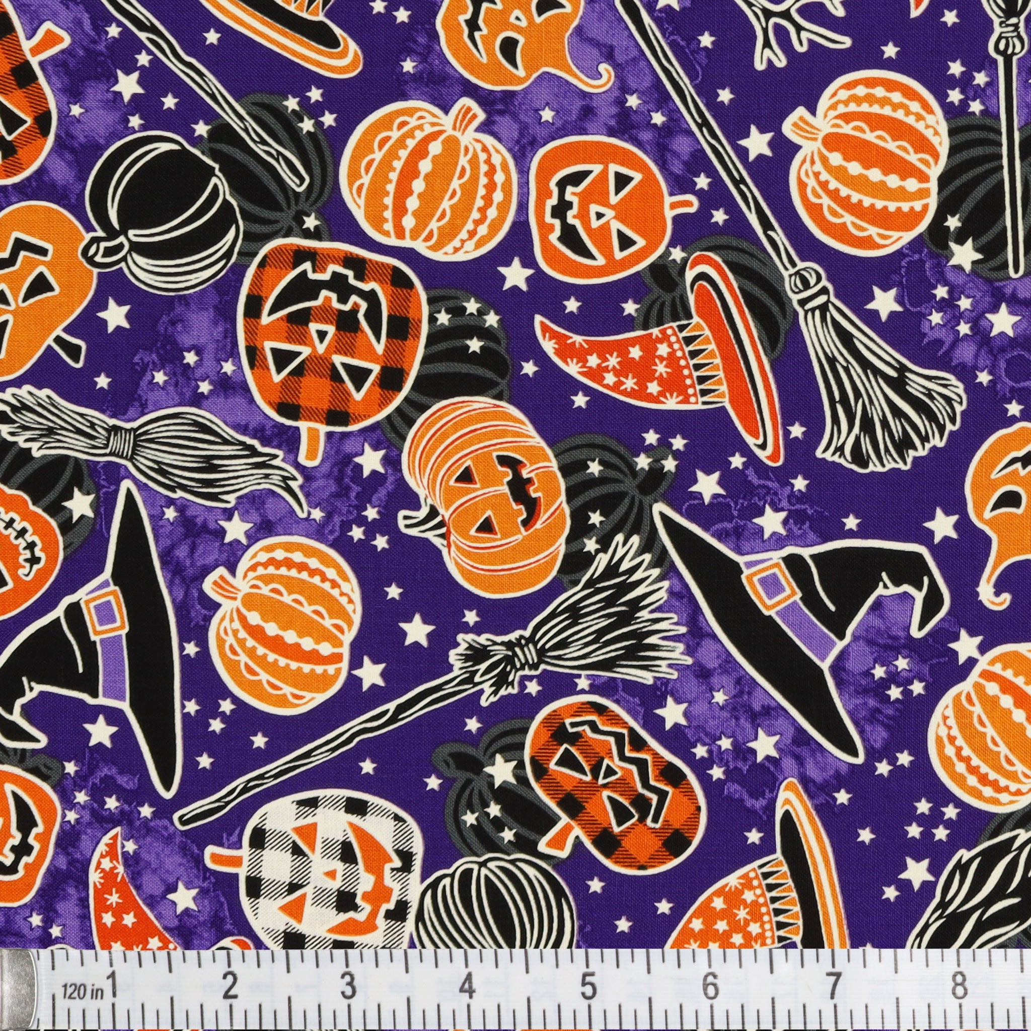 Light up your spooky season with the Happy Hauntings Fabric Collection by Kanvas Studio! Made from 100% cotton and enhanced with glow-in-the-dark magic, this playful Halloween collection is packed with witchy silhouettes, glowing jack-o'-lanterns, black cats, spiderwebs, and starry skies—all in a vivid palette of orange, purple, and eerie black. Whether you're sewing festive quilts, treat bags, or frightfully fun décor, these fabrics will make your Halloween creations come alive—day or night!