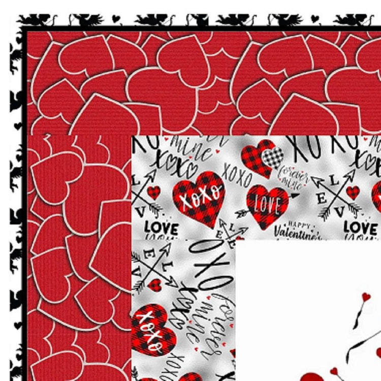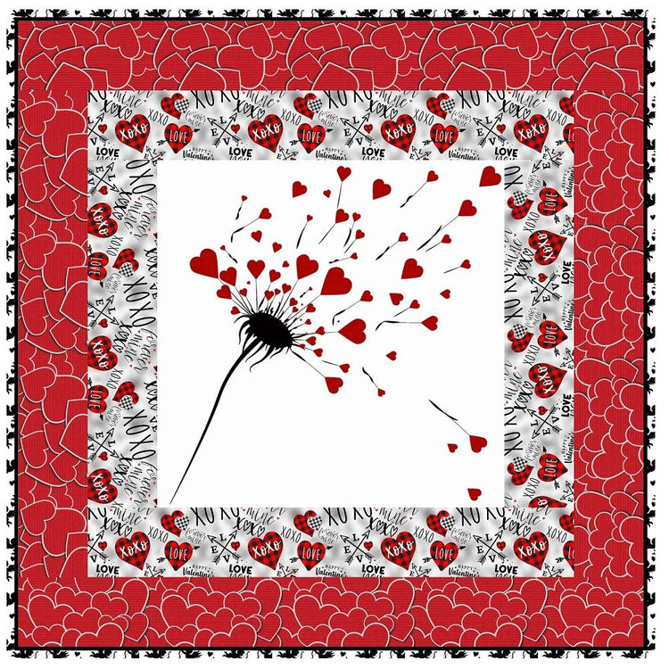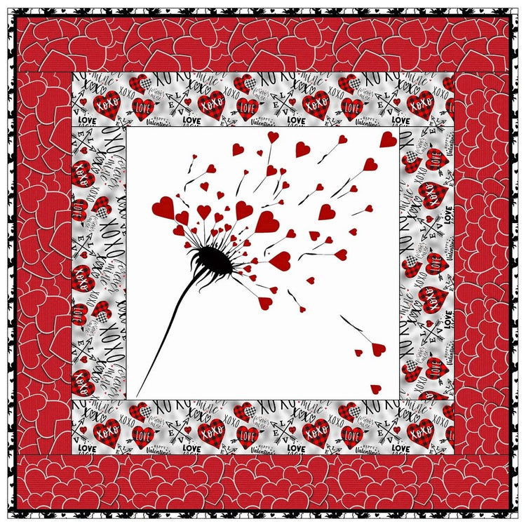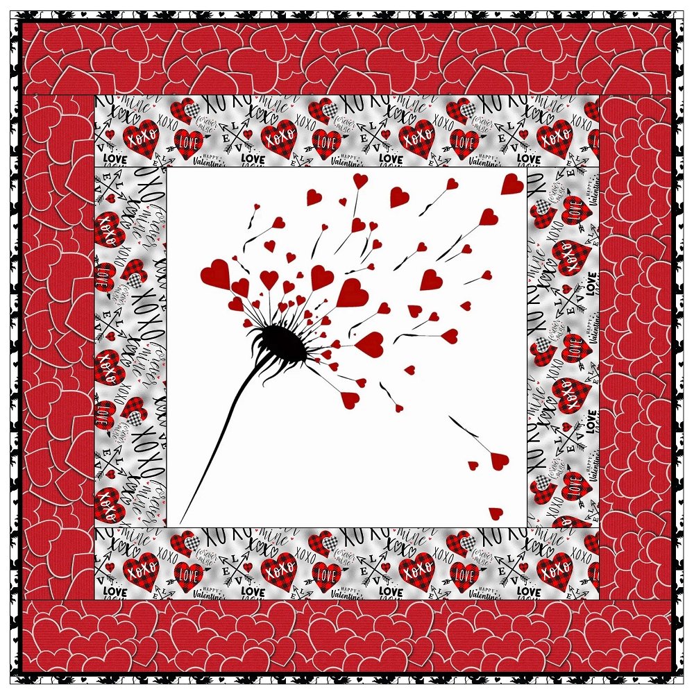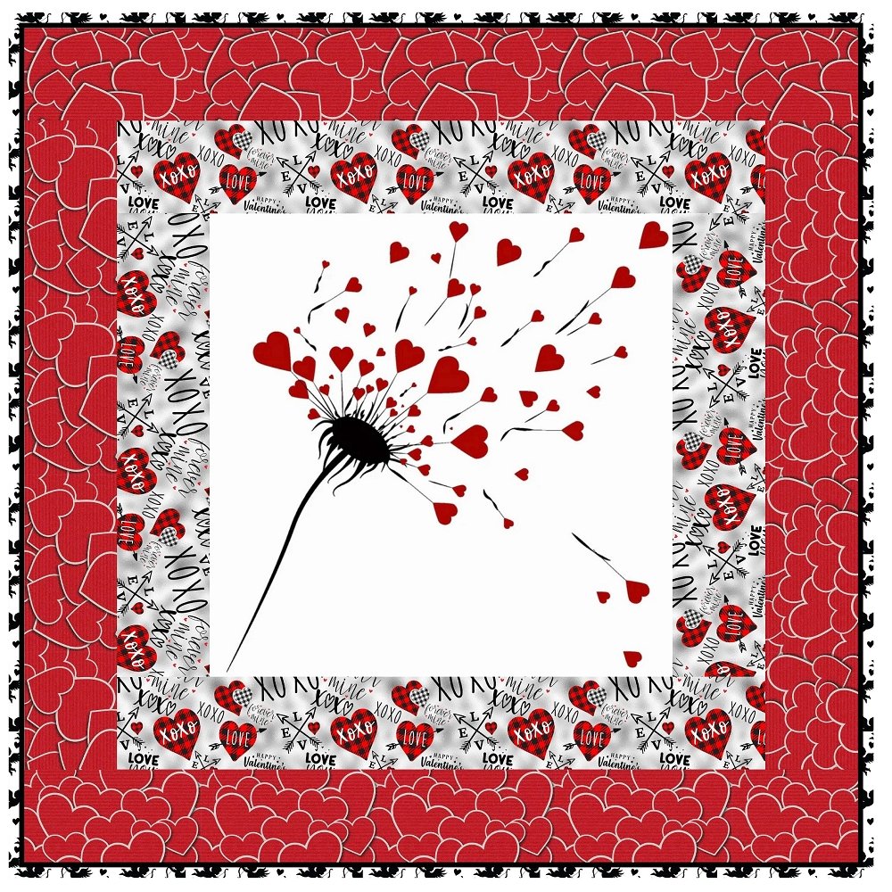 The Hearts Overflowing Wall Hanging includes everything that you need to make the quilt - the instructions and a total of 3 1/2 yards of fabric and a 23" panel. It has two borders and is finished with a flange binding. Batting is sold separately. The finished size of this quilt is 42" x 42".