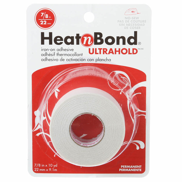 HeatnBond Ultrahold is a fusible webbing in the form of a tape. Apply Heat N Bond Ultrahold to fabrics for apparel, quilting, and craft sewing. This double-sided interfacing creates a permanent bond when ironed. Heat N Bond Ultrahold No-Sew Tape is available in three sizes 7/8", 5/8", and 7/8". Each roll contains 10-yards of Ultrahold No-Sew Tape.