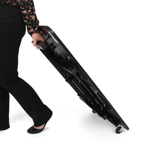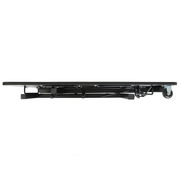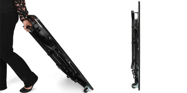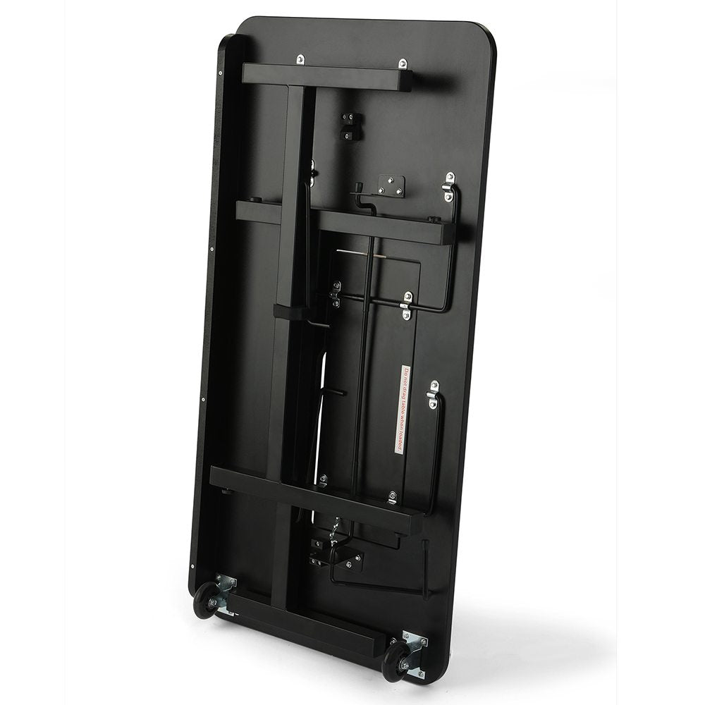 The Heavyweight Table is designed for quick setup and easy storage. When the table is folded away (40-1/2" x 19-3/4" x 4-1/2"), it will easily fit under your bed or in a closet. Located under the table, on the right side, are two wheels for easy mobility and portability. Weighing approximately 35 pounds, this table is lighter than some machines and comes fully assembled!