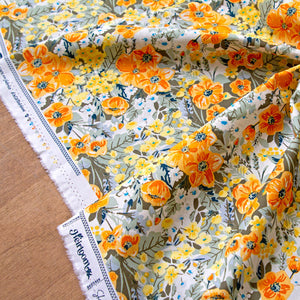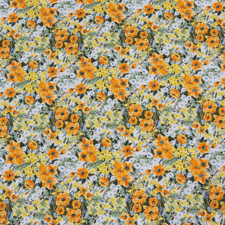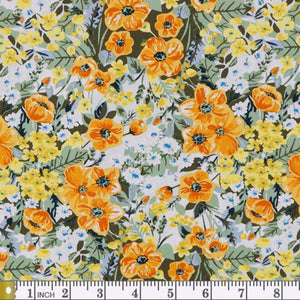 Bursting with sunshine and charm, this vivid floral print features warm marigold, daffodil, and tangerine blooms scattered across a soft, leafy backdrop. Tiny blue and white wildflowers peek out from the lush greenery, adding playful contrast and depth. Whether you're sewing a summer dress, cheerful quilt blocks, or fresh home décor, the Golden Days fabric infuses every project with joy and brightness. Its painterly style and layered botanical layout give it a dynamic, hand-crafted feel that's both nostalgic and modern.