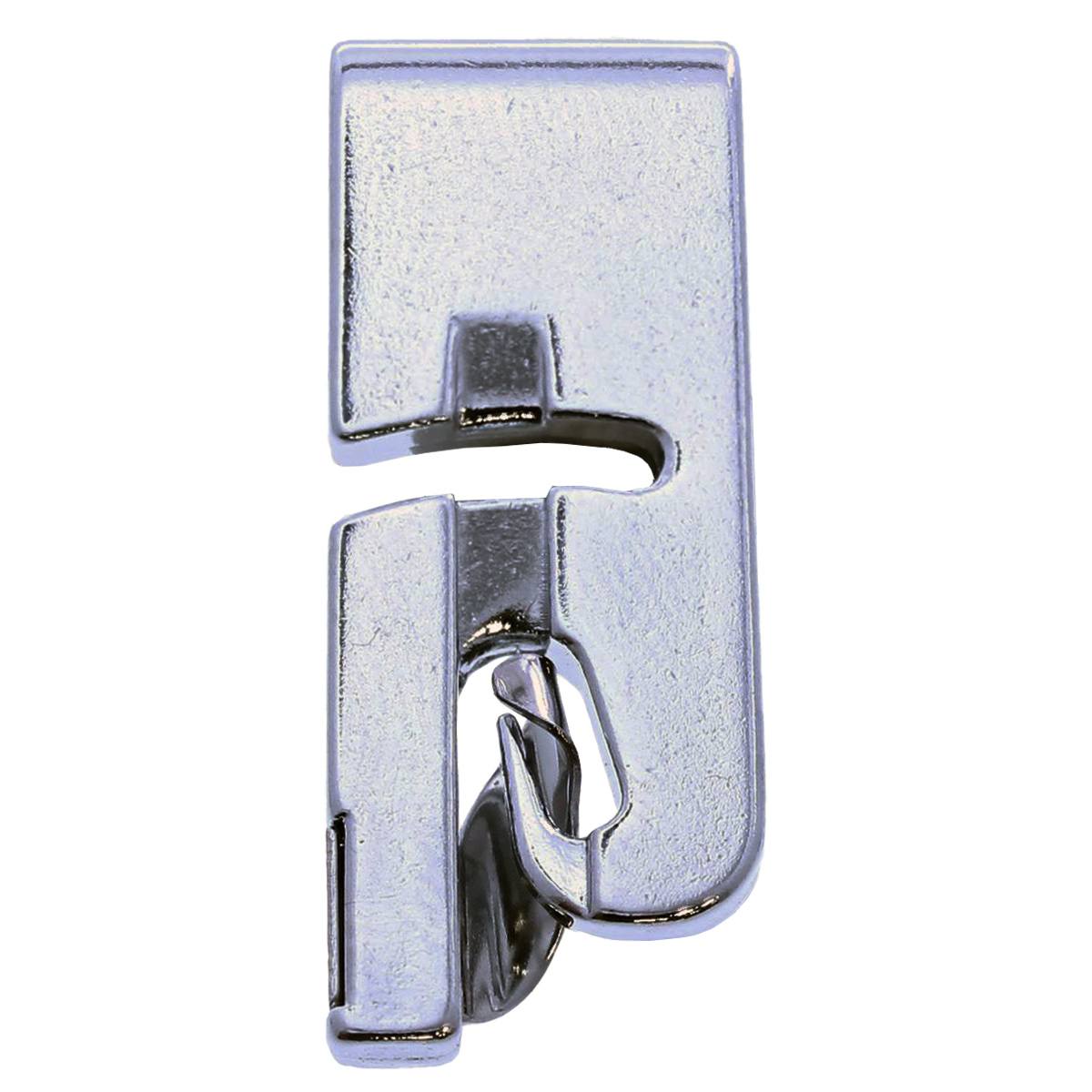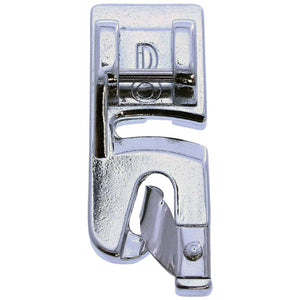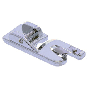 Feed your fabric through the small funnel located on the front of the foot. The funnel turns the fabric under while the needle stitches it down to create a perfect narrow hem.