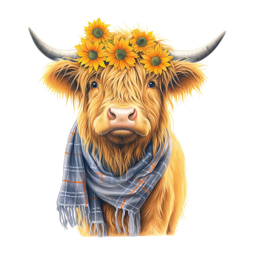 Highland Cow, Scarf, & Flowers #1 Fabric Panel