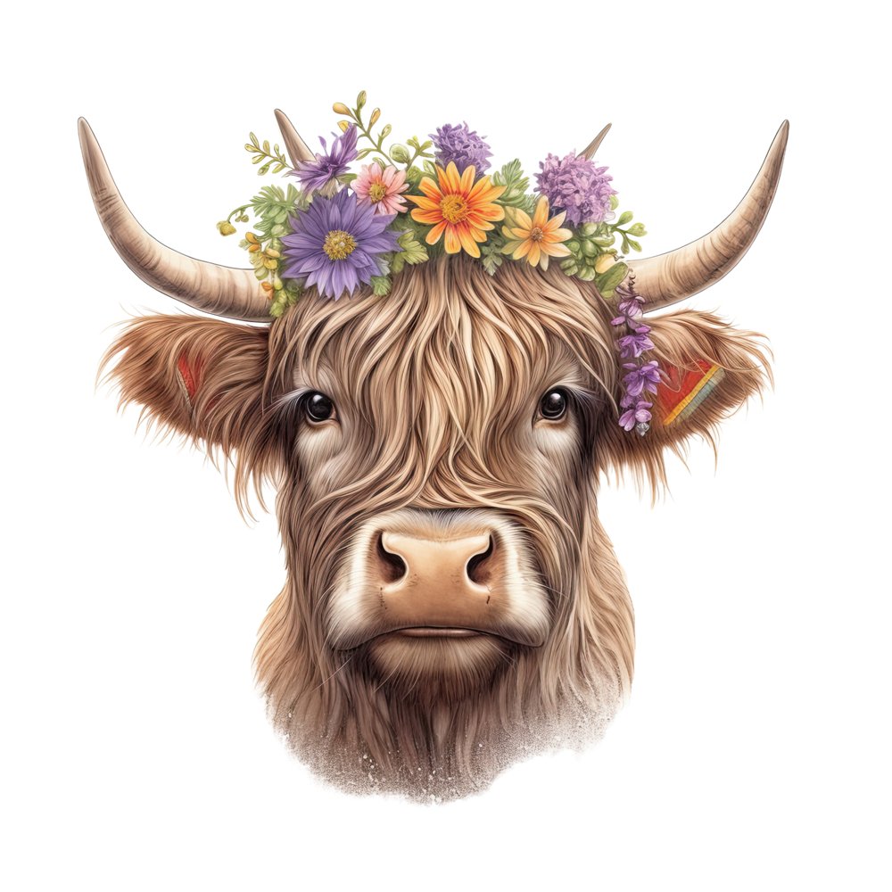 Highland Cow With Flower Crown #1 Fabric Panel Details