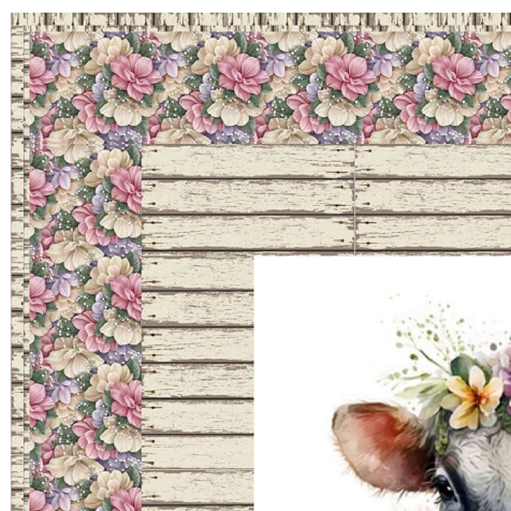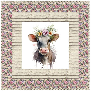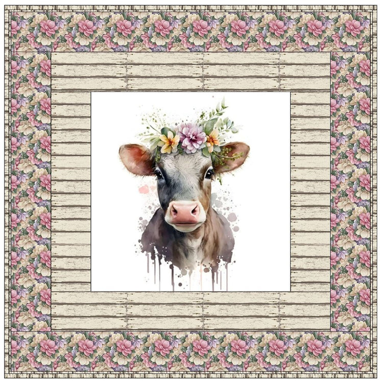 The Hippie Cow Wall Hanging includes everything that you need to make the quilt - the instructions and a total of 3 1/2 yards of fabric and a 23" panel. It has two borders and is finished with a flange binding. Batting is sold separately. The finished size of this quilt is 42" x 42".