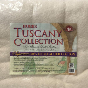 Introducing the densest and plushest batting from Hobbs, the Tuscany Supreme 100% Natural Cotton Batting provides a smooth and even finish. Perfect for both hand and machine quilting, this batting is made from 100% natural, lightly needle-punched, unbleached cotton and contains no scrim or binders. Prewashing is not recommended. Shrinkage of 4-6% is standard, leaving your quilt with an antique puckered appearance. Ideal for use with medium and dark fabrics. Hobbs Tuscany Supreme 100% Natural Cotton Batting can be quilted from 1/4" up to 3" apart. Manufactured and distributed in the USA. Available in a Twin Size (72" x 96"), Queen Size (90" x 108"), and King Size (120" x 120").