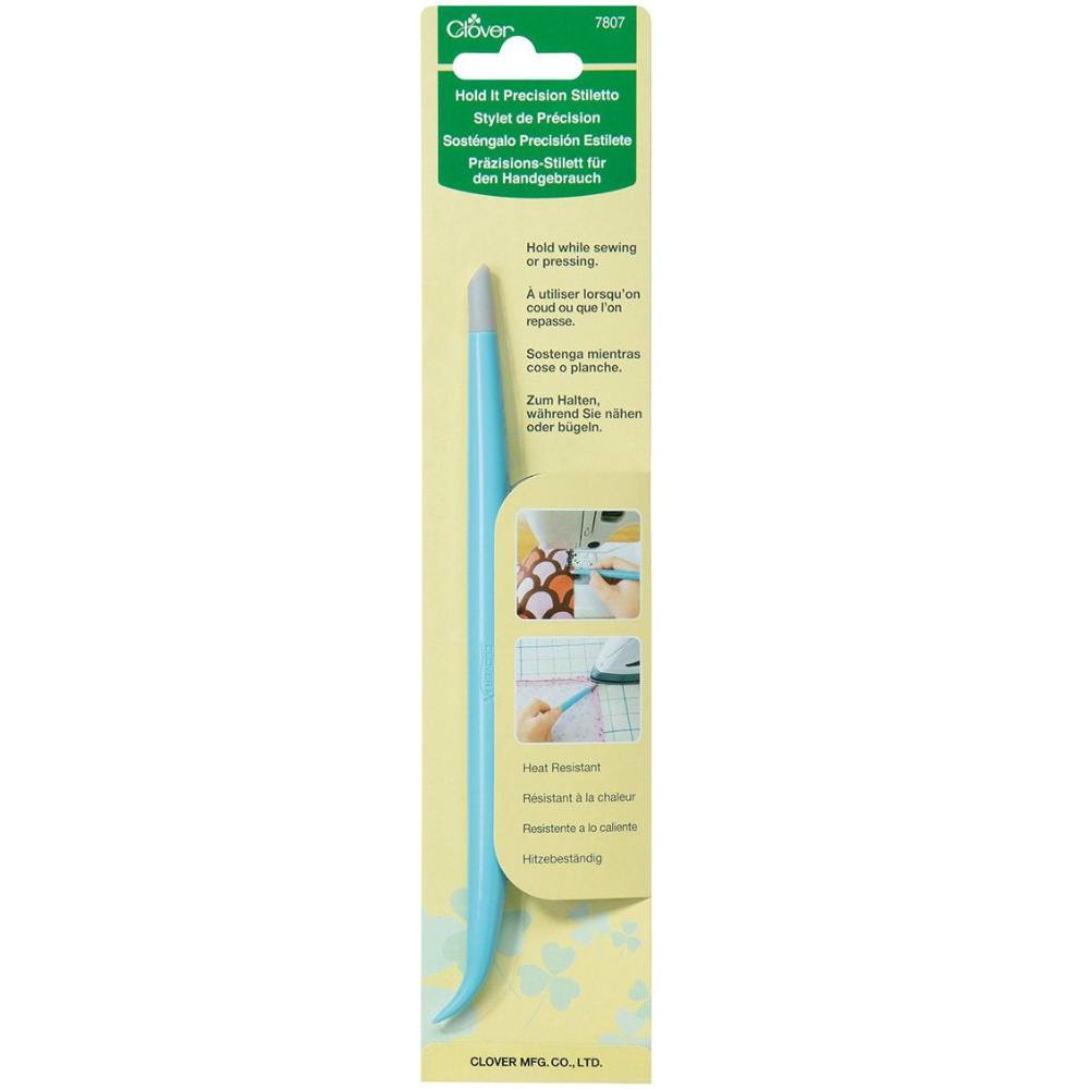 The Clover Hold It Precision Stiletto features a heat-resistant tip to work near an iron while pressing. Doll clothes, applique, mitered corners, or any close or small work area can be held safely in place when ironing. The stiletto allows you to maintain the fabric where the action takes place, preventing any mistaken punctures or pinches, and allows more visibility and stitch control. Use whichever tip benefits the needs of your fabric and sewing project.