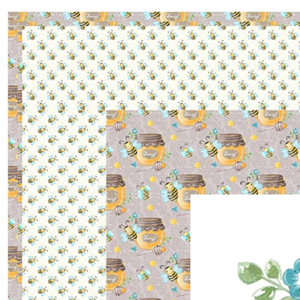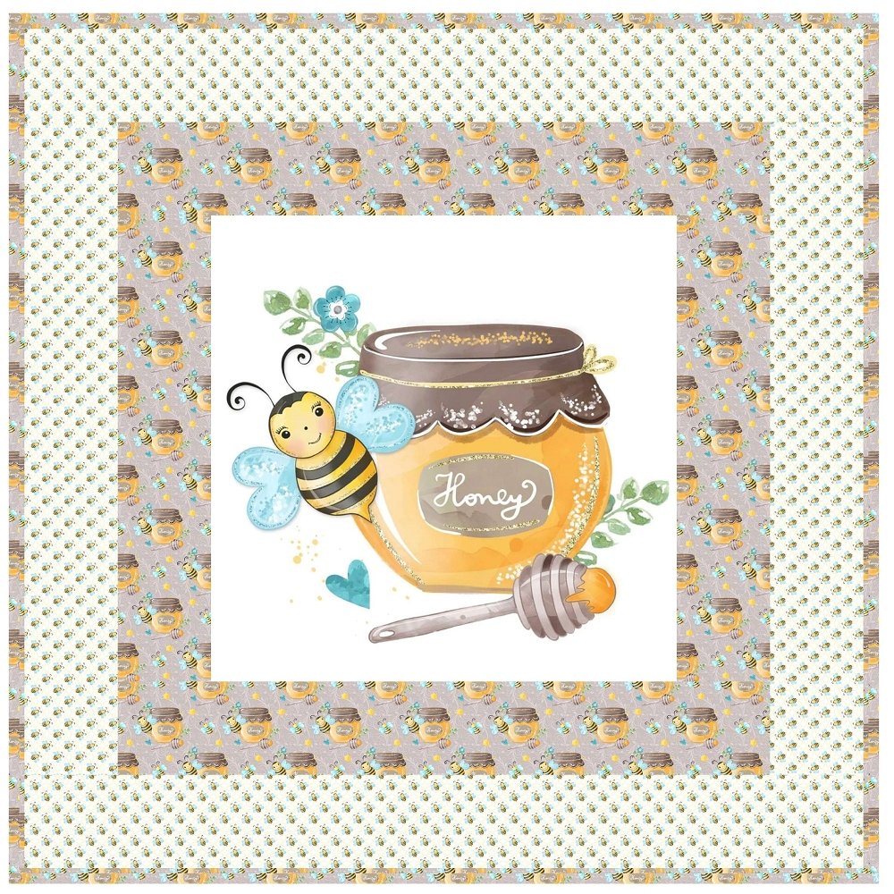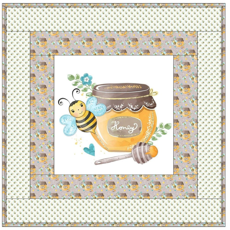 The Honey Bee and Jar Wall Wall Hanging includes everything that you need to make the quilt - the instructions and a total of 3 1/2 yards of fabric and a 23" panel. It has two borders and is finished with a flange binding. Batting is sold separately. The finished size of this quilt is 42" x 42".