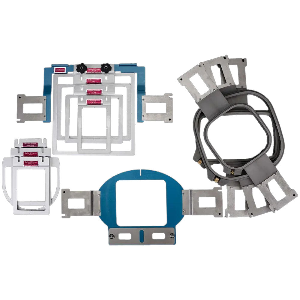 Durkee promises high quality embroidery hoops that out perform other hoops on the market. Products are developed based on customer feedback and are satisfaction guaranteed. This Six and Ten Needle Kit comes with Durkee's three most popular tubular hoops (one 24cmx24cm, one 12.5cmx24cm, and one 15cmx15cm), one Durkee Cap Frame, and one complete EZ Frame 7 Piece Combo Kit. This EZ frame combo kit includes the main attachment arm (A), one 2"x 4" frame, one 2.5"x 4" frame, one 3"x 4" frame, one 5"x 4" frame, one 7"x 5" frame, one 8"x 8" frame, and one cap back/radius frame.